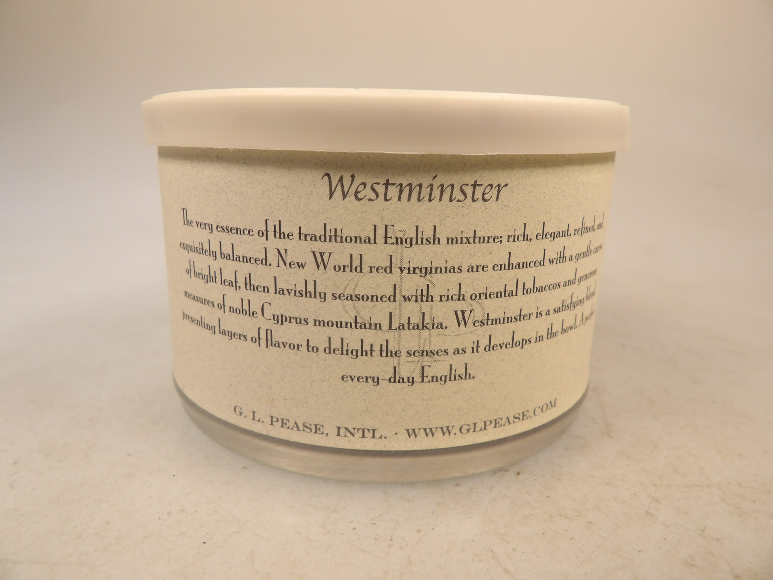 DESCRIPTION: Here is an auction for sale. It is a Vintage Collectible G.L. Pease Westminster 2oz’s Sealed Pipe Tobacco Tin from 2008. This tin is sealed and has never been opened. Westminster: The very essence of the traditional English mixture; rich, elegant, refined, and exquisitely balanced. New World red Virginias are enhanced with a gentle caress of bright leaf, then lavishly seasoned with rich oriental tobaccos and generous measures of noble Cyprus mountain latakia. Westminster is a satisfying blend, presenting layers of flavor to delight the senses and develop in the bowl. A perfect everyday English mixture. Full bodied, finished & packed in 2008. Good Luck Bidding and Thanks for Stopping by.