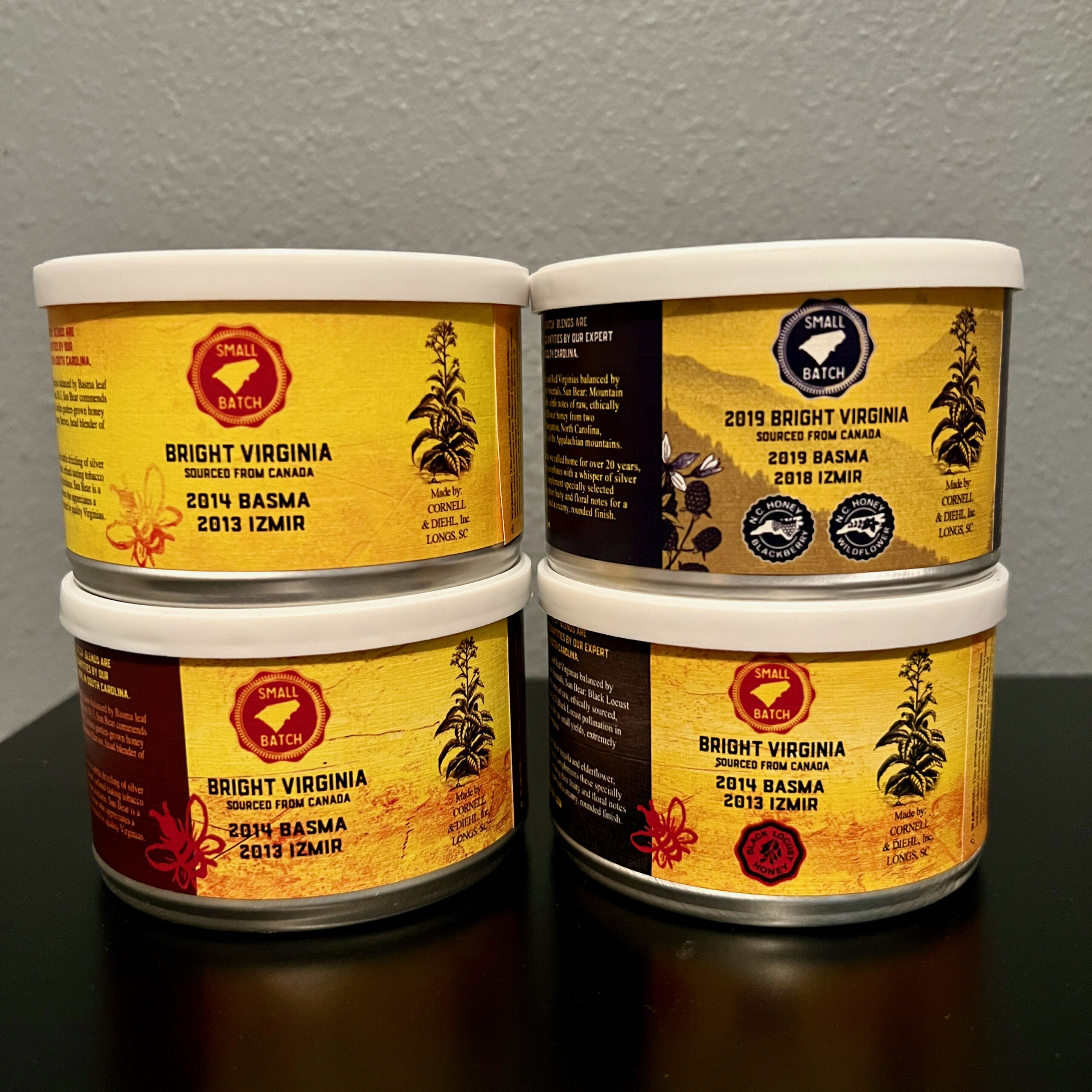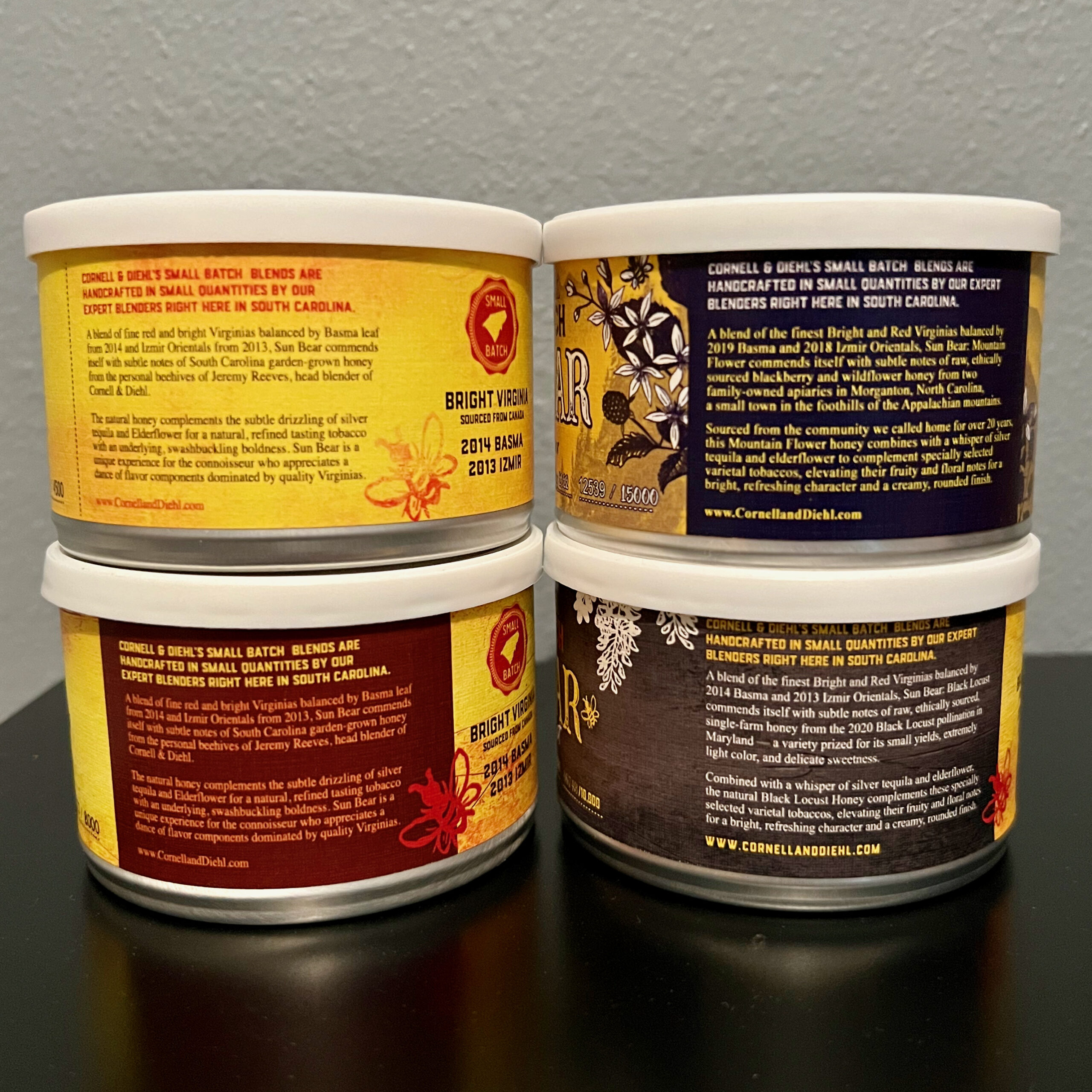 This auction includes ALL FOUR iterations of Sun Bear Small Batch Blend by Cornell & Diehl. The 2 oz tins are all sealed and in excellent condition.