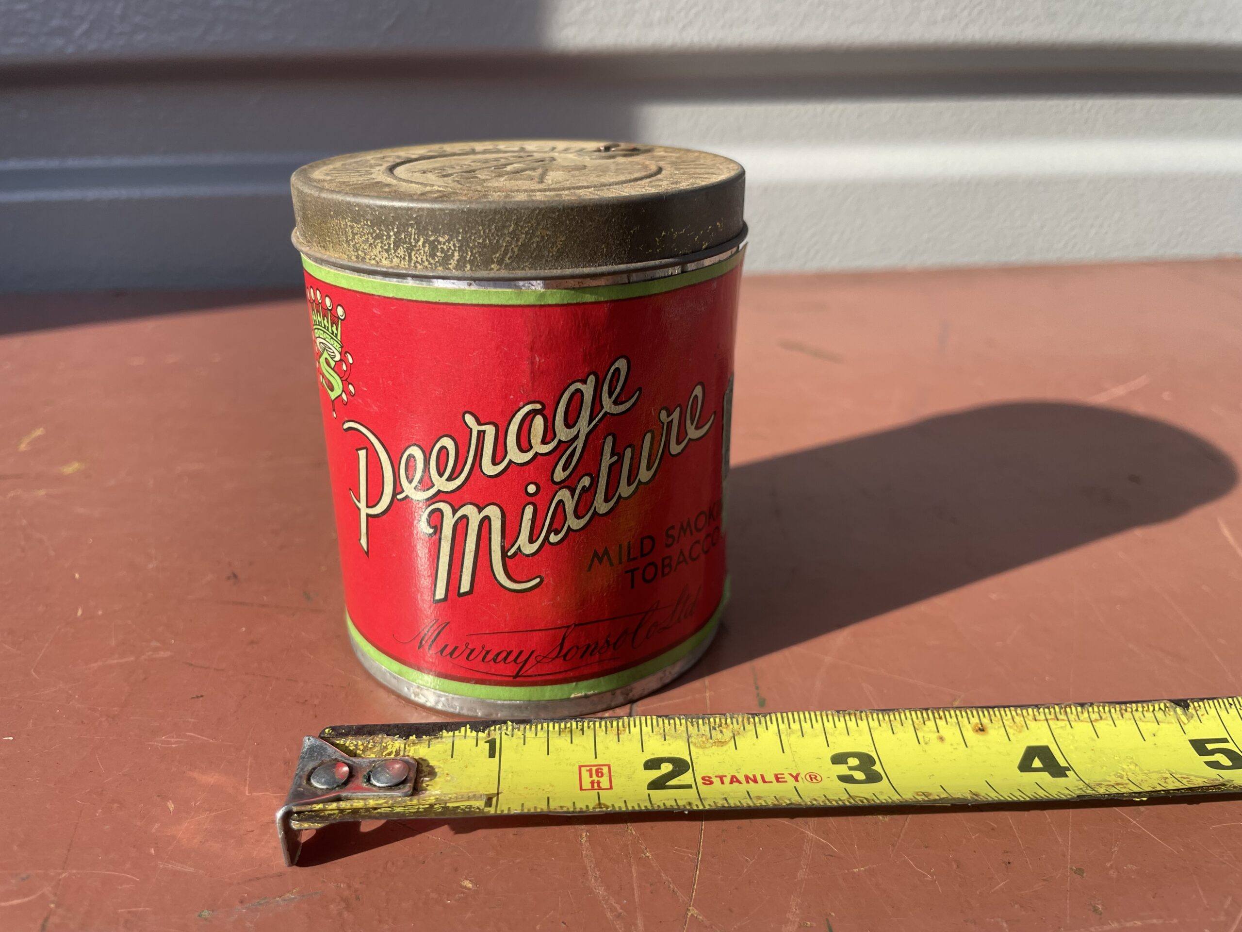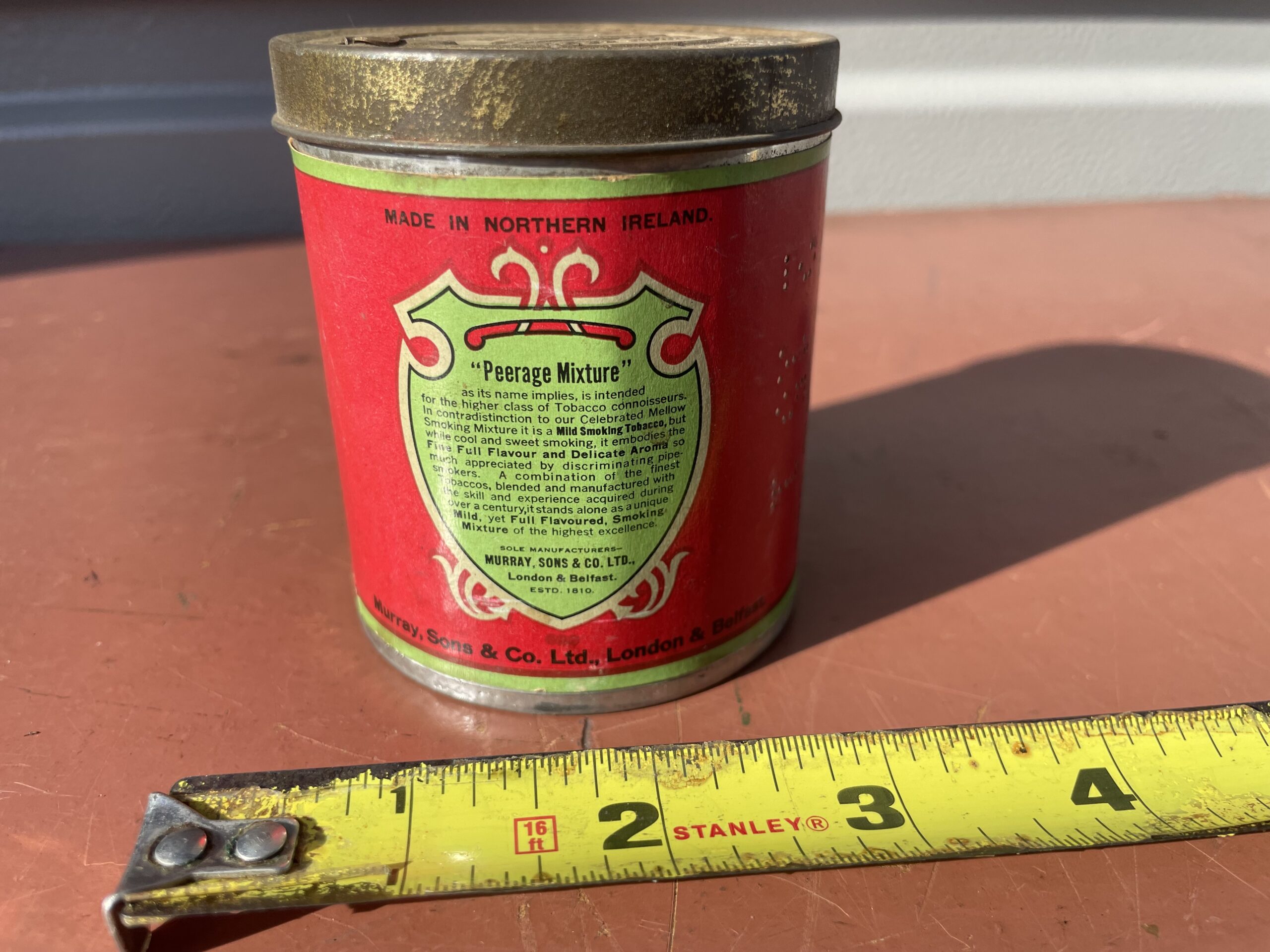 Vintage 1940s Murry & Sons LTD, Ireland. Peerage Mixture 1/2 full opened tin . 2 oz tin that smells wonderful. No Reserve! GOOD LUCK!