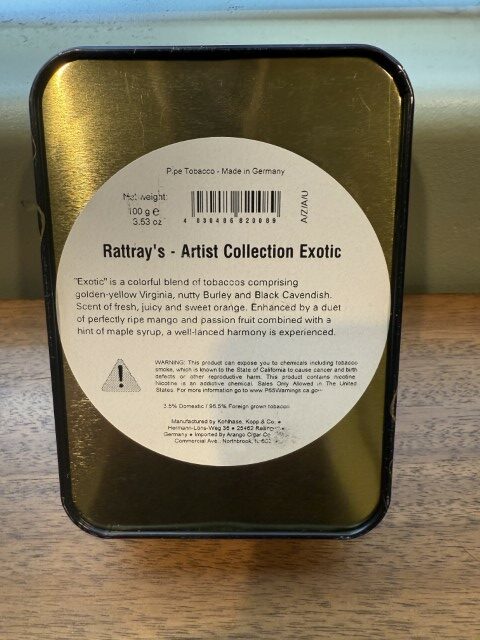 From Smoking Pipes website: Rattray's Exotic Orange is fittingly named, the aroma from the mix of Virginias and black cavendish calling to mind black teas flavored with an orange zest. Due to EU laws, the blend is now called Exotic Passion, though in the USA, it's still labeled Exotic Orange.
