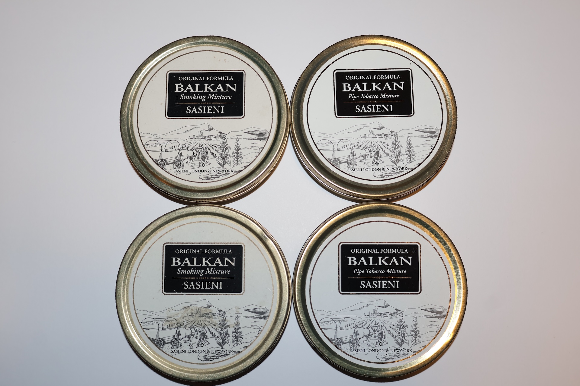 Four tins of Balkan Sasieni that are at least five years old but likely older.
