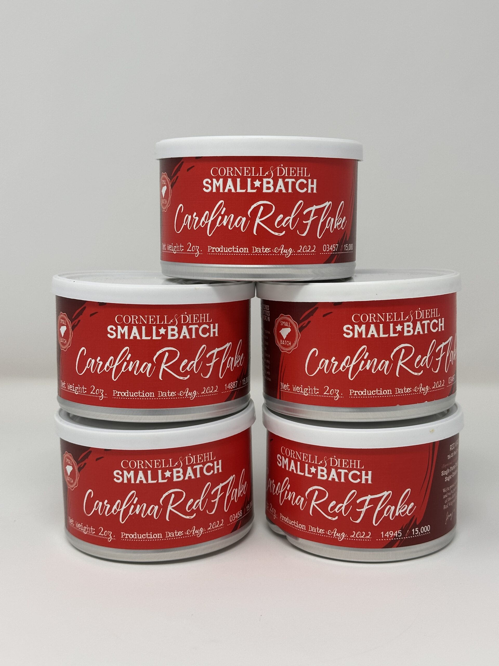 5x Sealed 2oz. Tins of 2022 Cornell & Diehl Carolina Red Flake Tins. All kept in climate controlled cellar since purchase. Worth noticing - all tins are slightly swollen, which does not affect taste or condition of tobacco - tested.