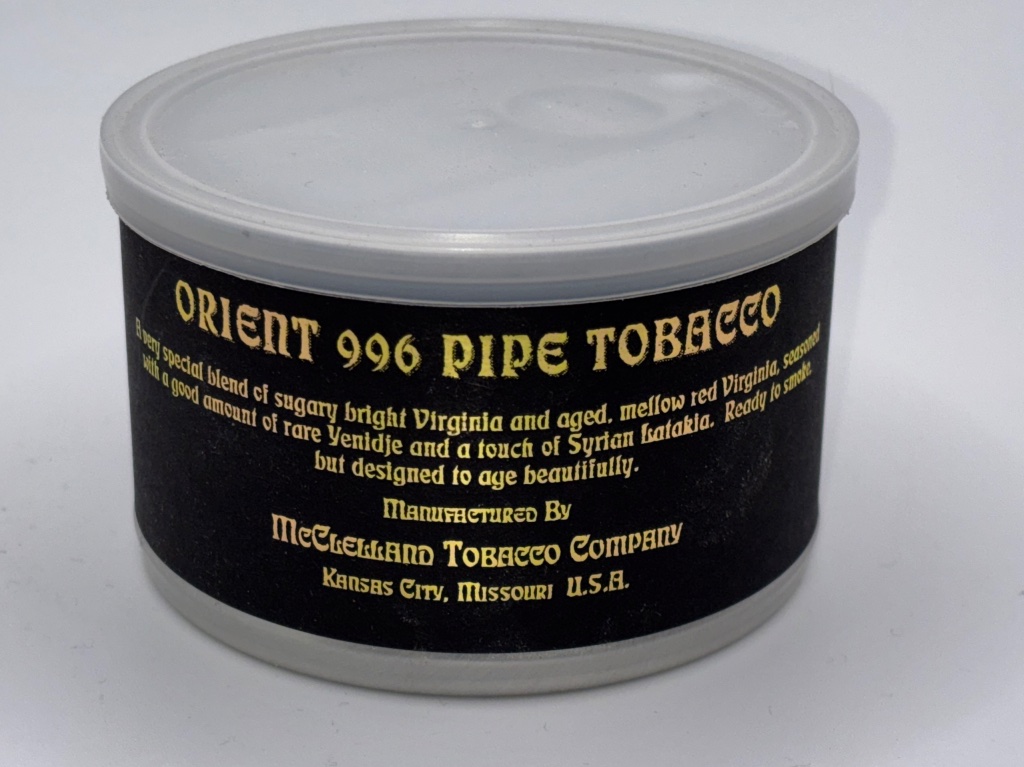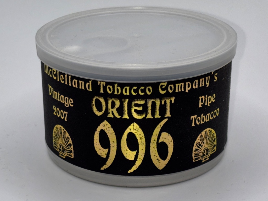 One unopened tin of McClelland Orient 996 from my private collection. Was purchased new by me in 2017 and cellared in the dark at a near constant 68 degrees ever since.