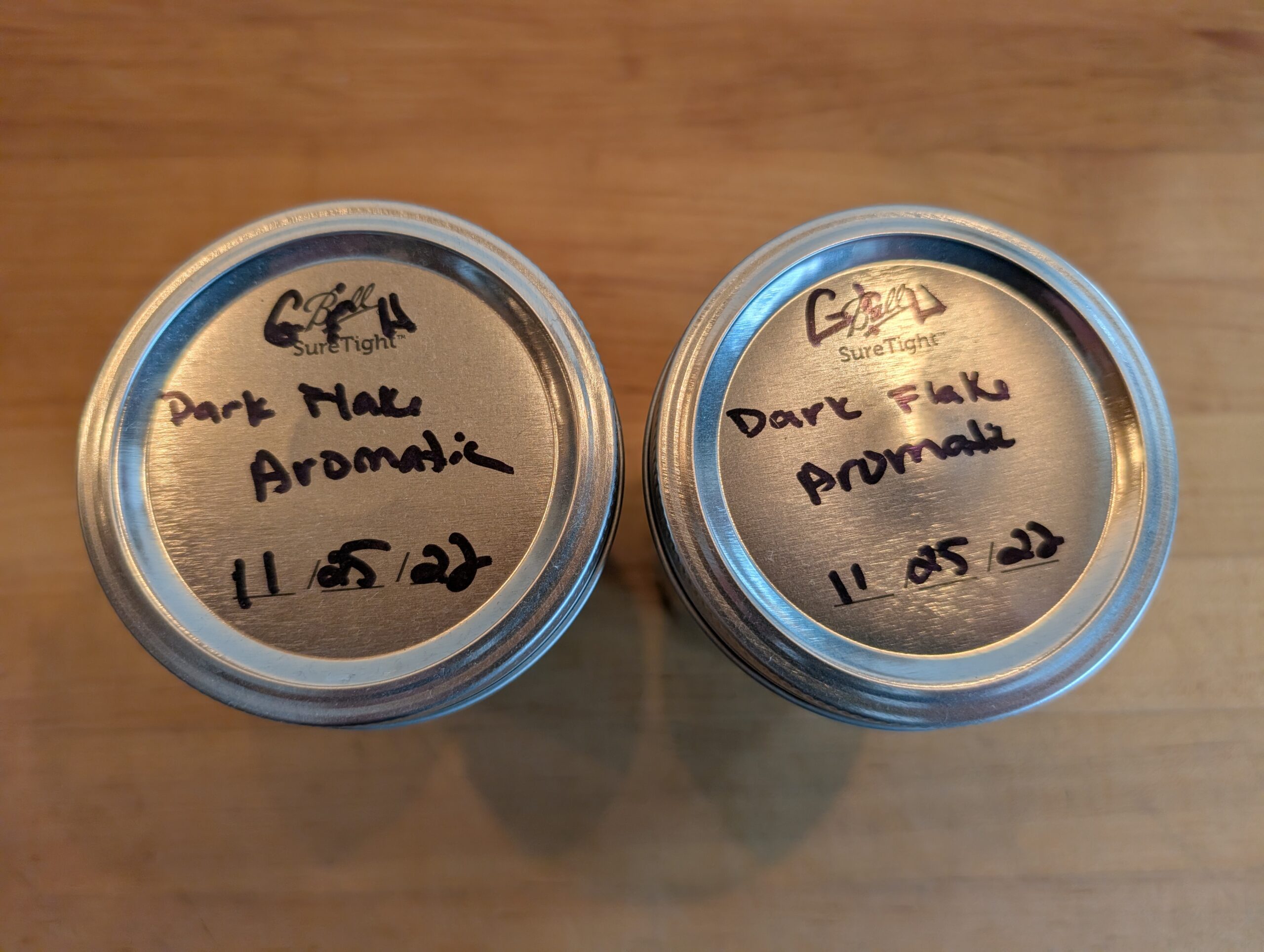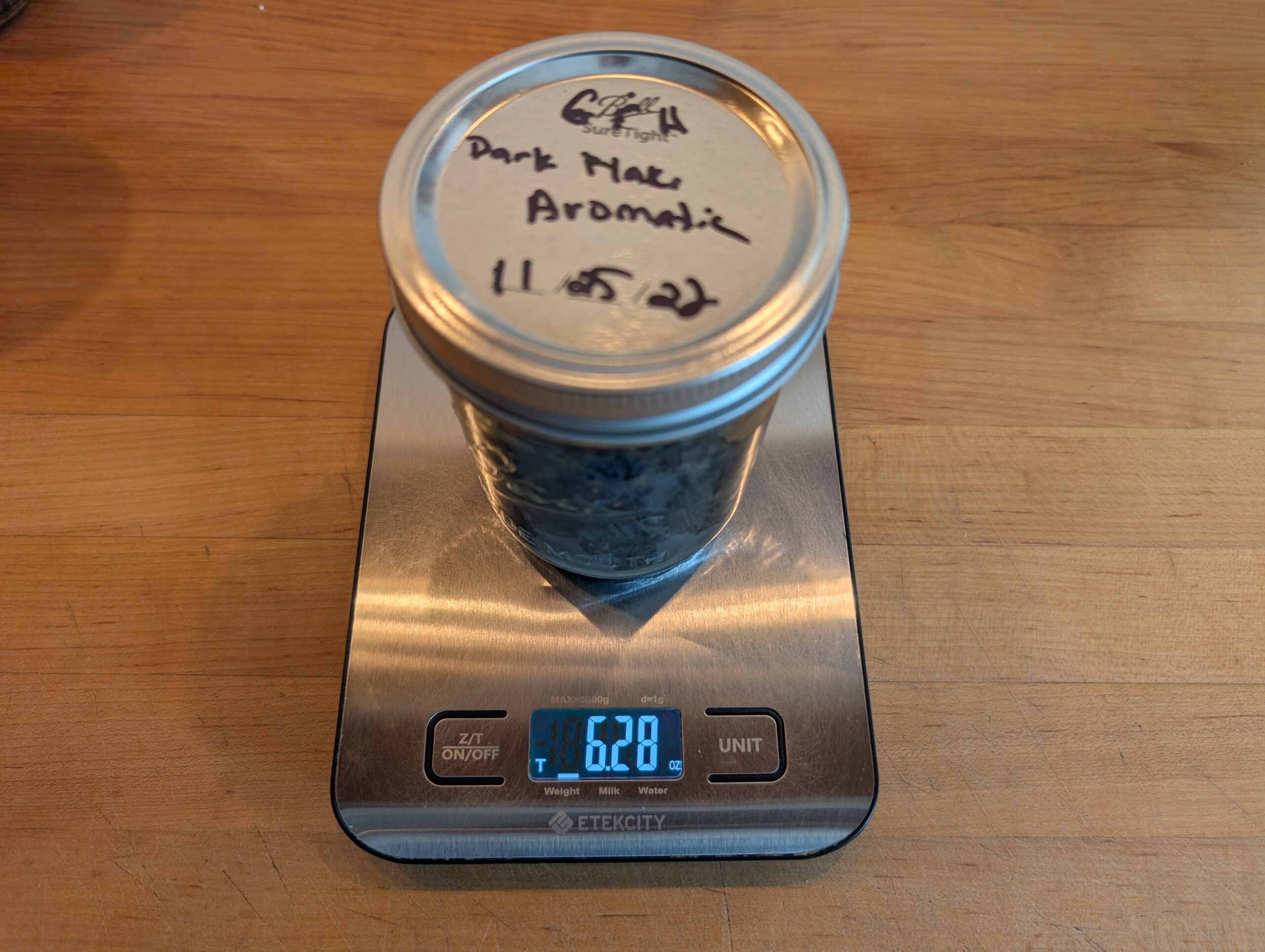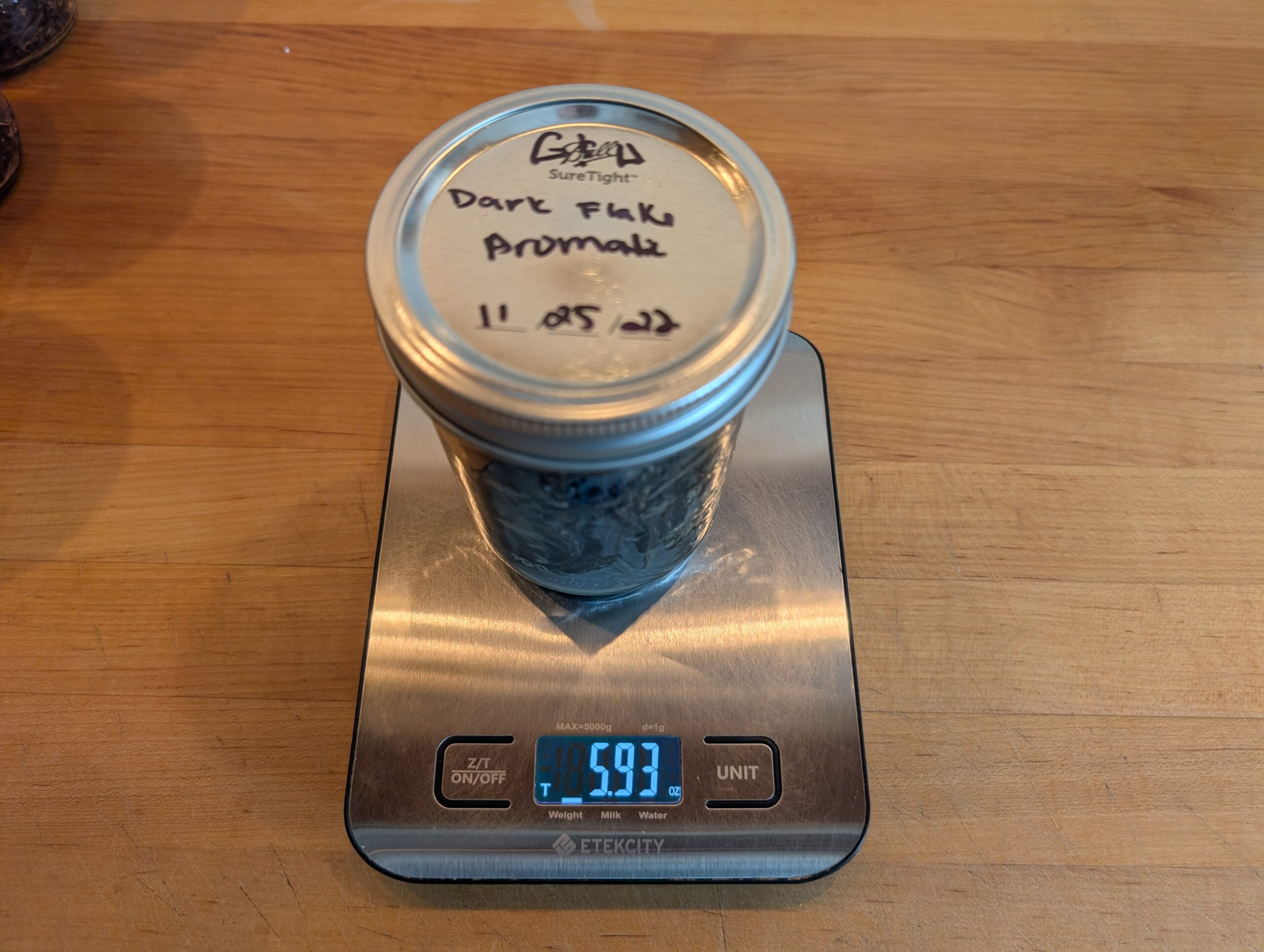 2 - Jars of Dark Flake Aromatic purchased and jarred in 2022. Total weight 12 oz. Scale zero'd with empty jar.