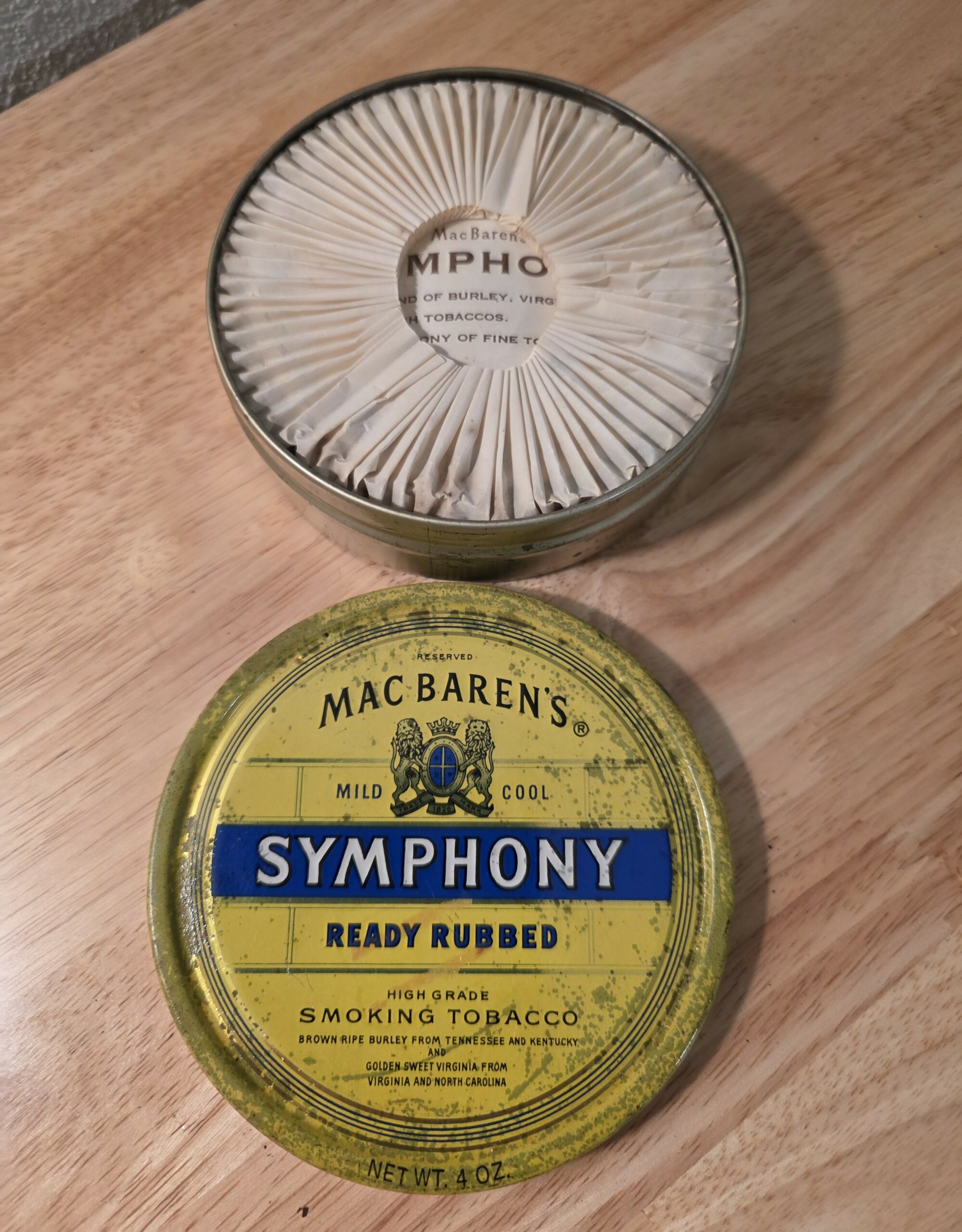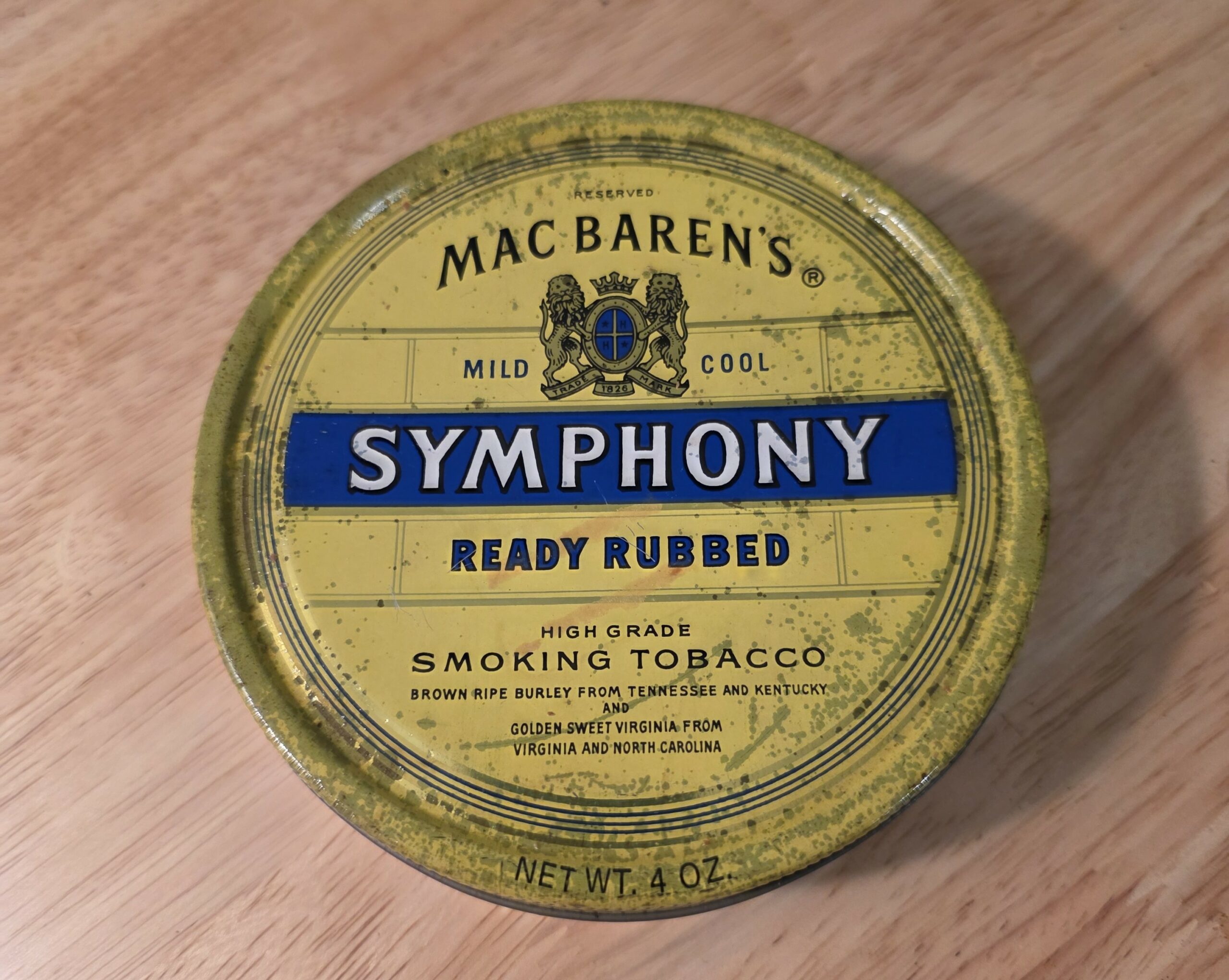 A unique treasure found in a local pipe enthusiasts cellar. The contents in this tin of Mac Baren Symphony Ready Rubbed have remained unused with original paper cover. Tin has been opend to verify contents are intact and unpuffed. NOTE: This tobacco was not vacuum sealed when produced. Approximate manufacturing late 1970s to early 1980s. Please take a moment to look at my other finds from this local estate.