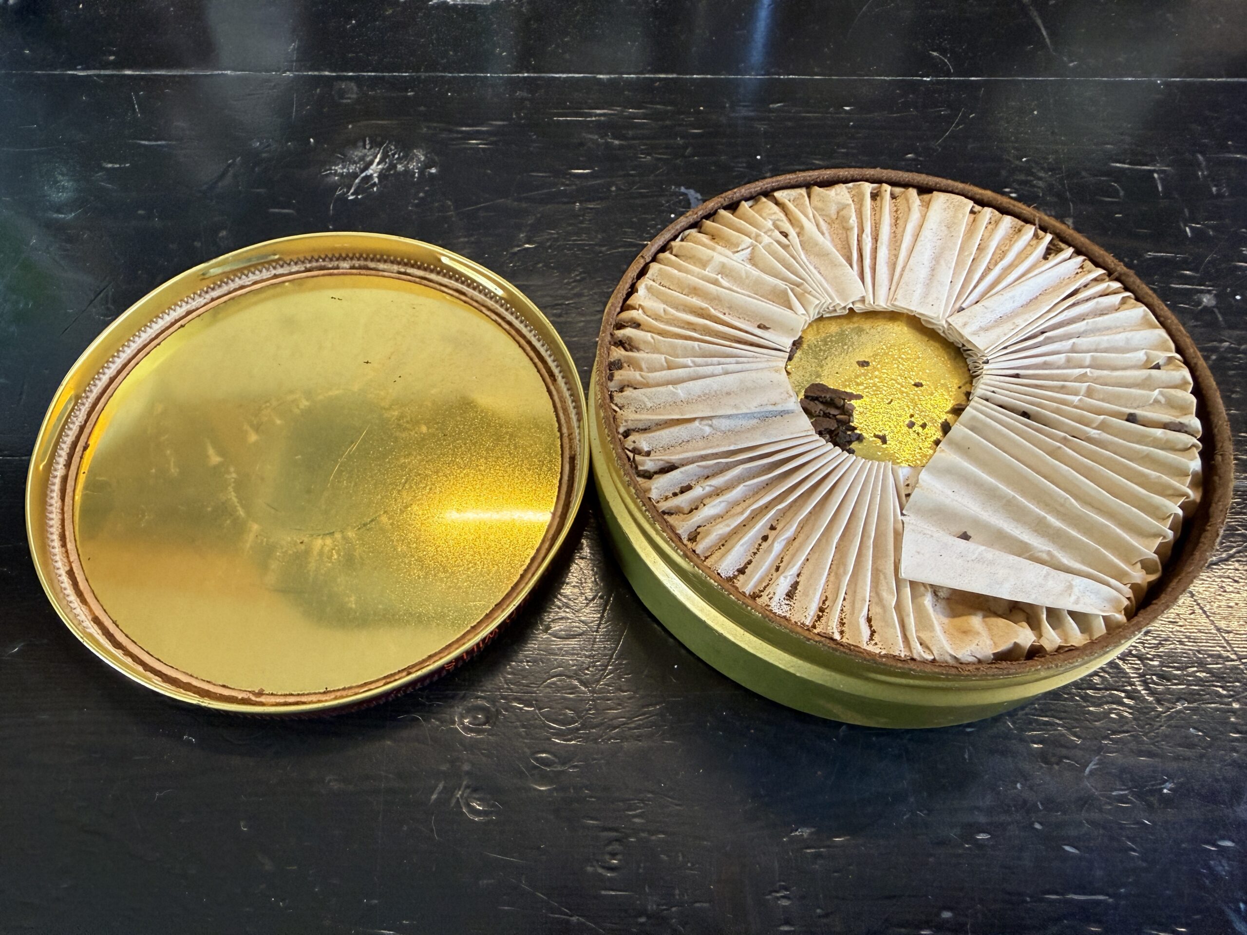 Rare. Full tin. Made in Denmark. Tin has shelf wear. Tin contents are undisturbed, but seal is compromised. Will require rehydration.