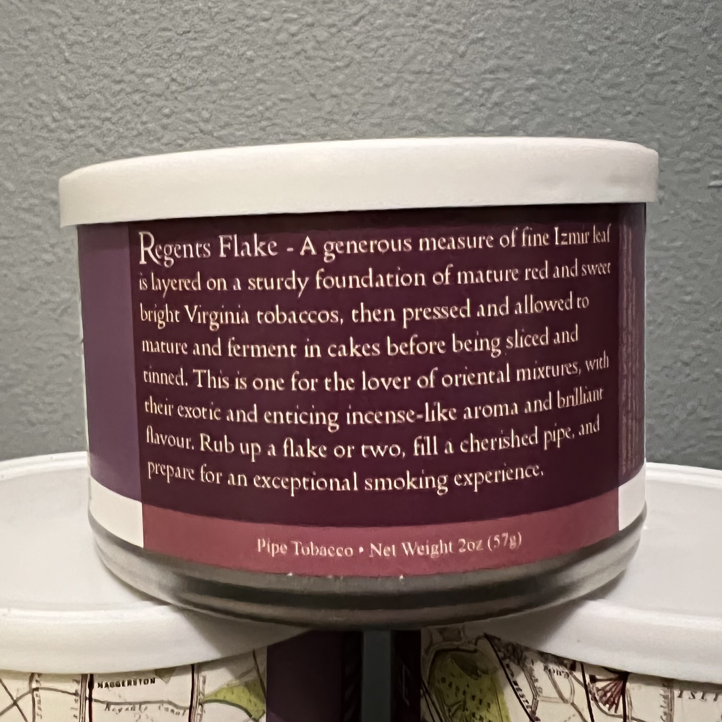 “A generous measure of fine Izmir leaf is layered on a sturdy foundation of mature red and sweet bright Virginia tobaccos, then pressed and allowed to mature and ferment in cakes before being sliced and tinned. This is one for the lover of Oriental mixtures, with their exotic and enticing incense-like aroma and brilliant flavour. Rub up a flake or two, fill a cherished pipe, and prepare for an exceptional smoking experience.“