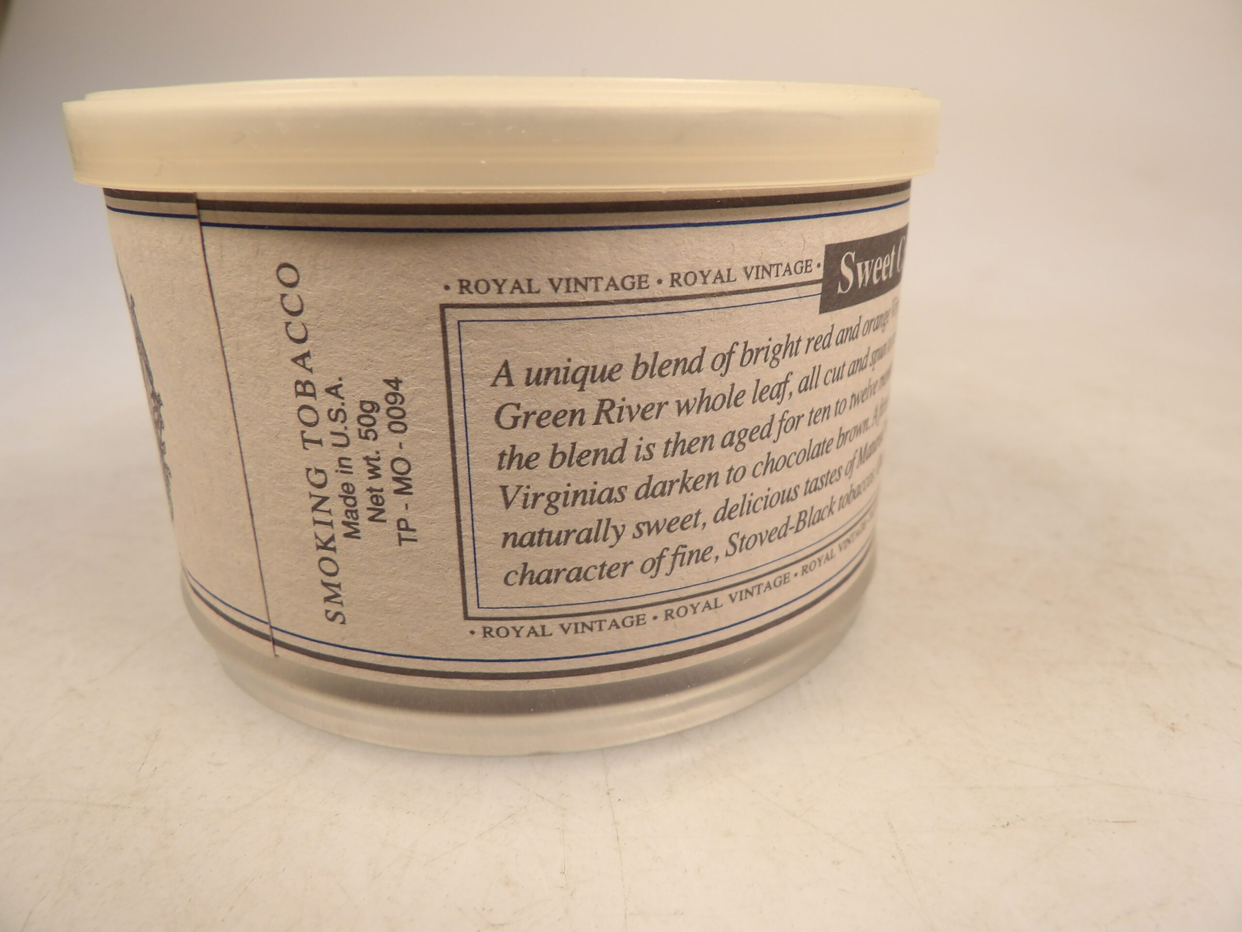 DESCRIPTION: Here is an auction sale. It is a Collectible 1999 Butera’s Royal Vintage Sweet Cavendish Sealed 50g Pipe Tobacco Tin. A unique blend of Bright Red & Orange Virginia's with equal measures of Toasted Black Green River whole leaf, all cut and spun to ribbon form. It’s easy to pack and light for an even cool white ash burn and taste on the tongue. Good Luck Bidding, Thanks for stopping by.