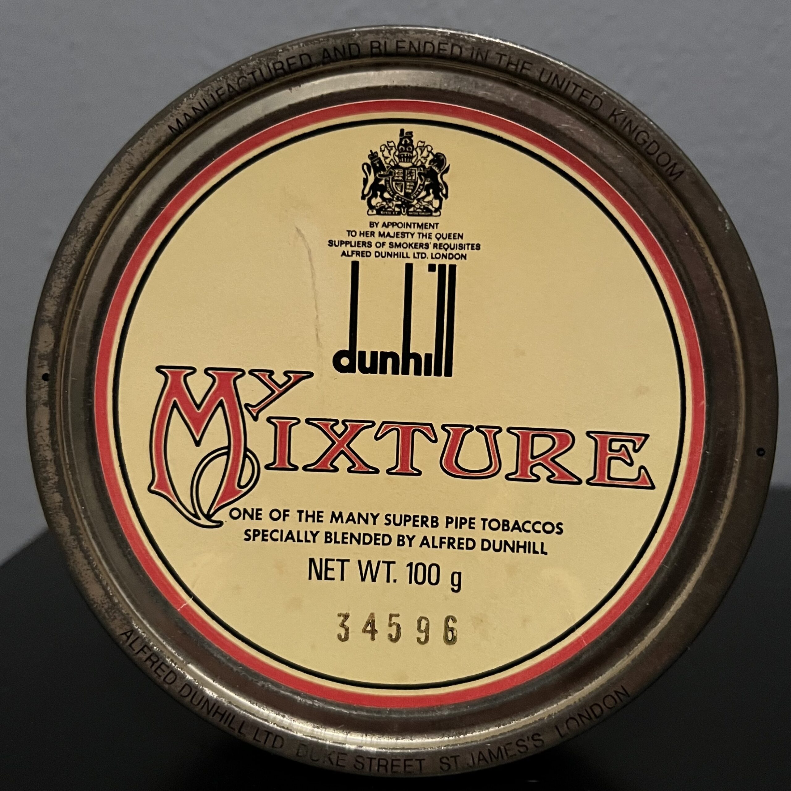 Seemingly well sealed tin of Dunhill My Mixture circa 1980s.