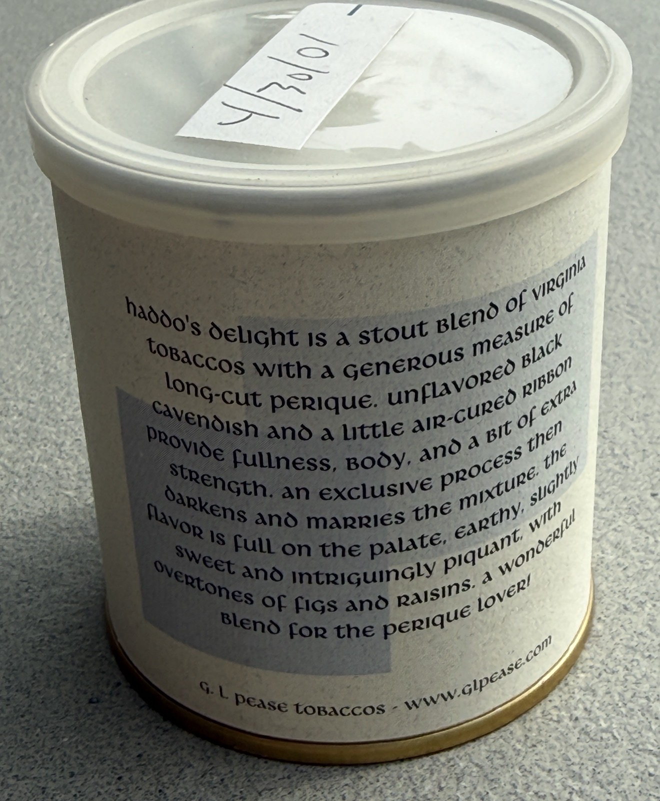 Sealed tin of GL Pease Haddo’s Delight. Full Virginia with Perique - 2001