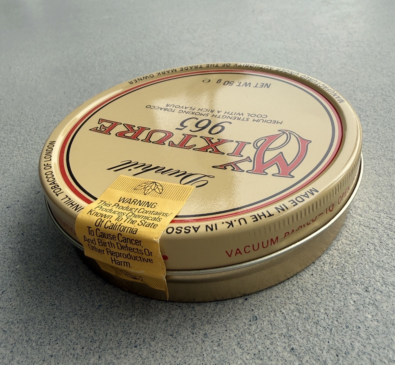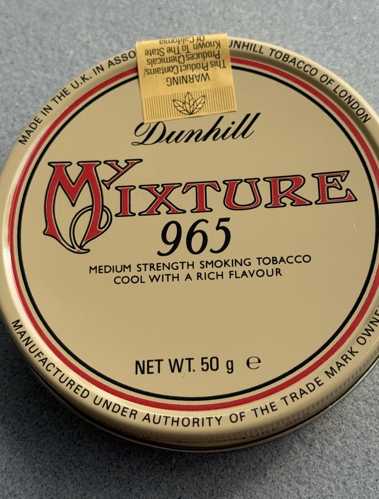 Sealed 50 gram tin of Dunhill Mixture 965. Medium strength tobacco with a cool rich flavor