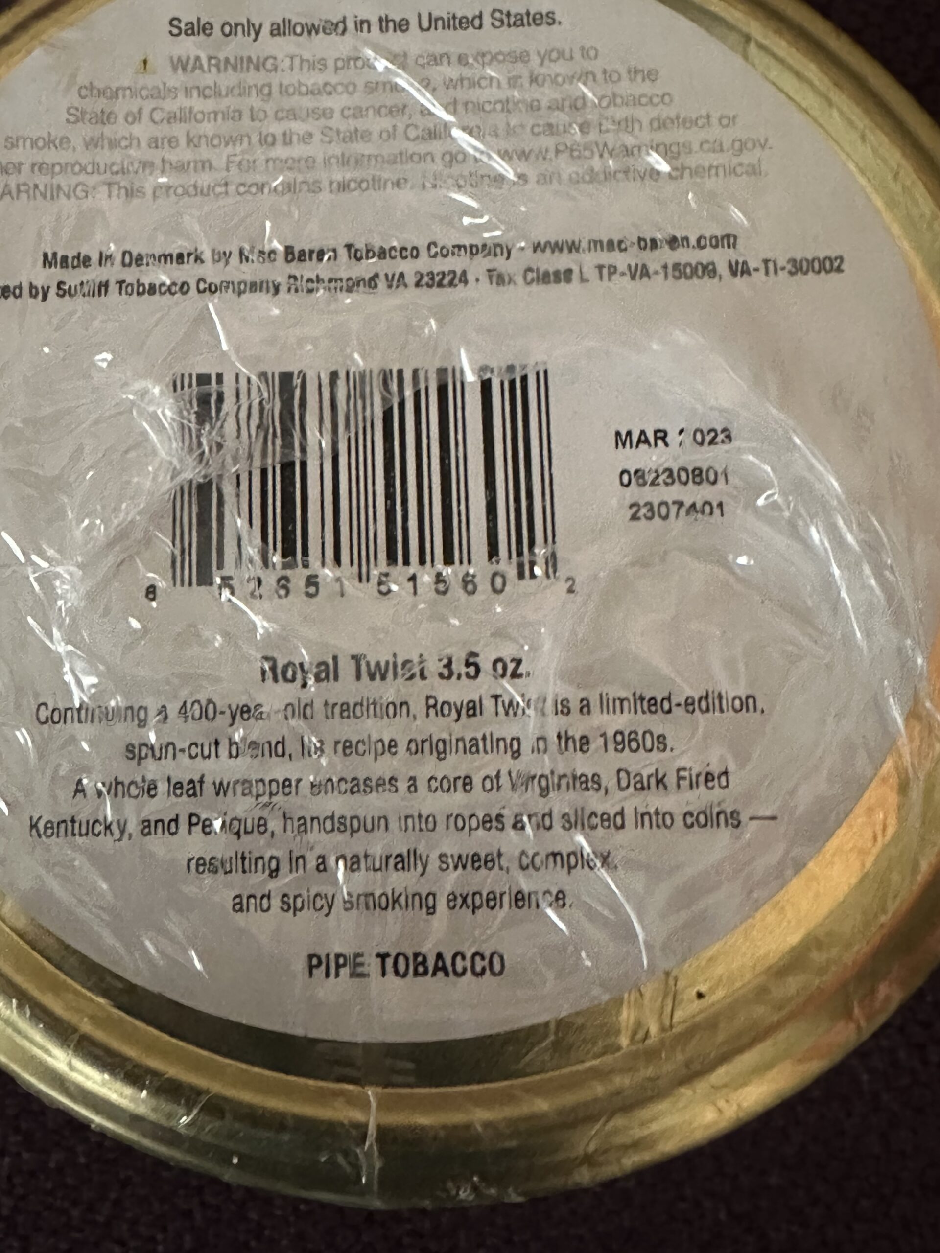 You are bidding on three sealed 3.5 ounce tins of discontinued Mac Baren Royal Twist from 2023.