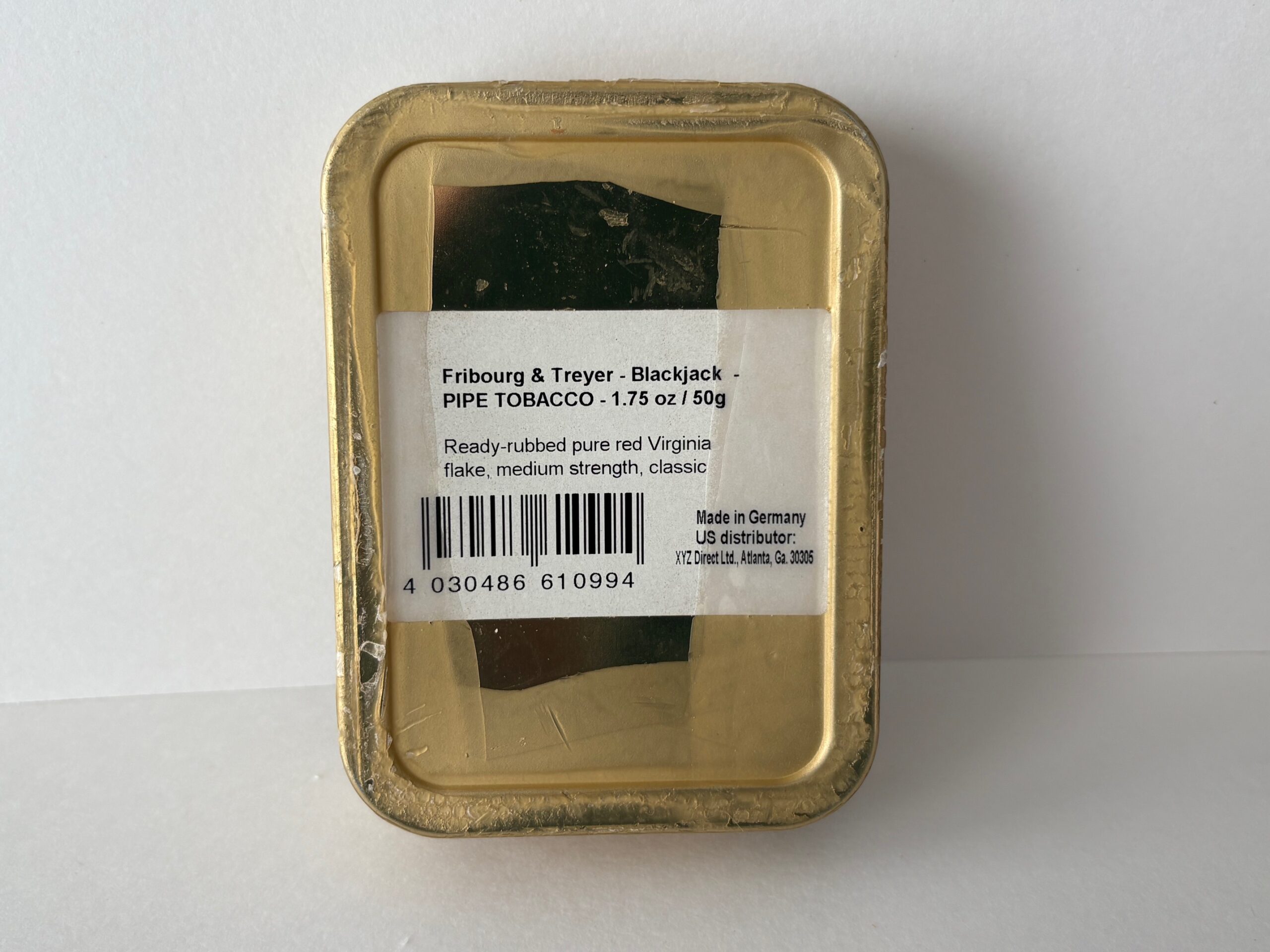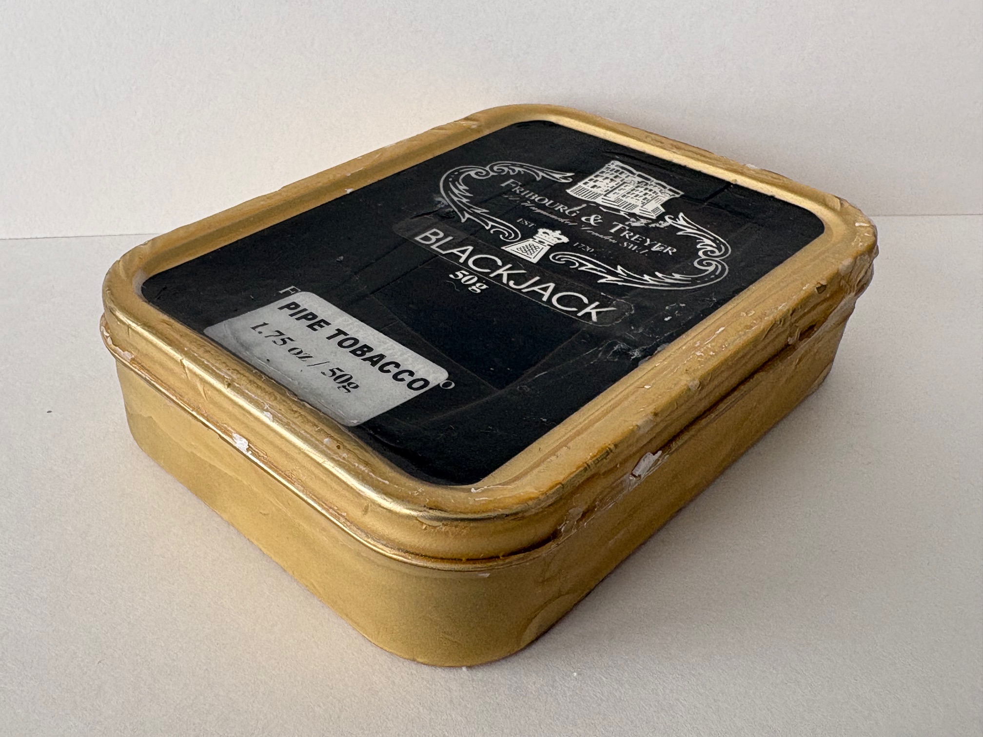 Unopened 50g tin of Early 2000's Fribourg & Treyer Blackjack. Purchased from collector in 2013. Collector sealed unopened tin in wax.