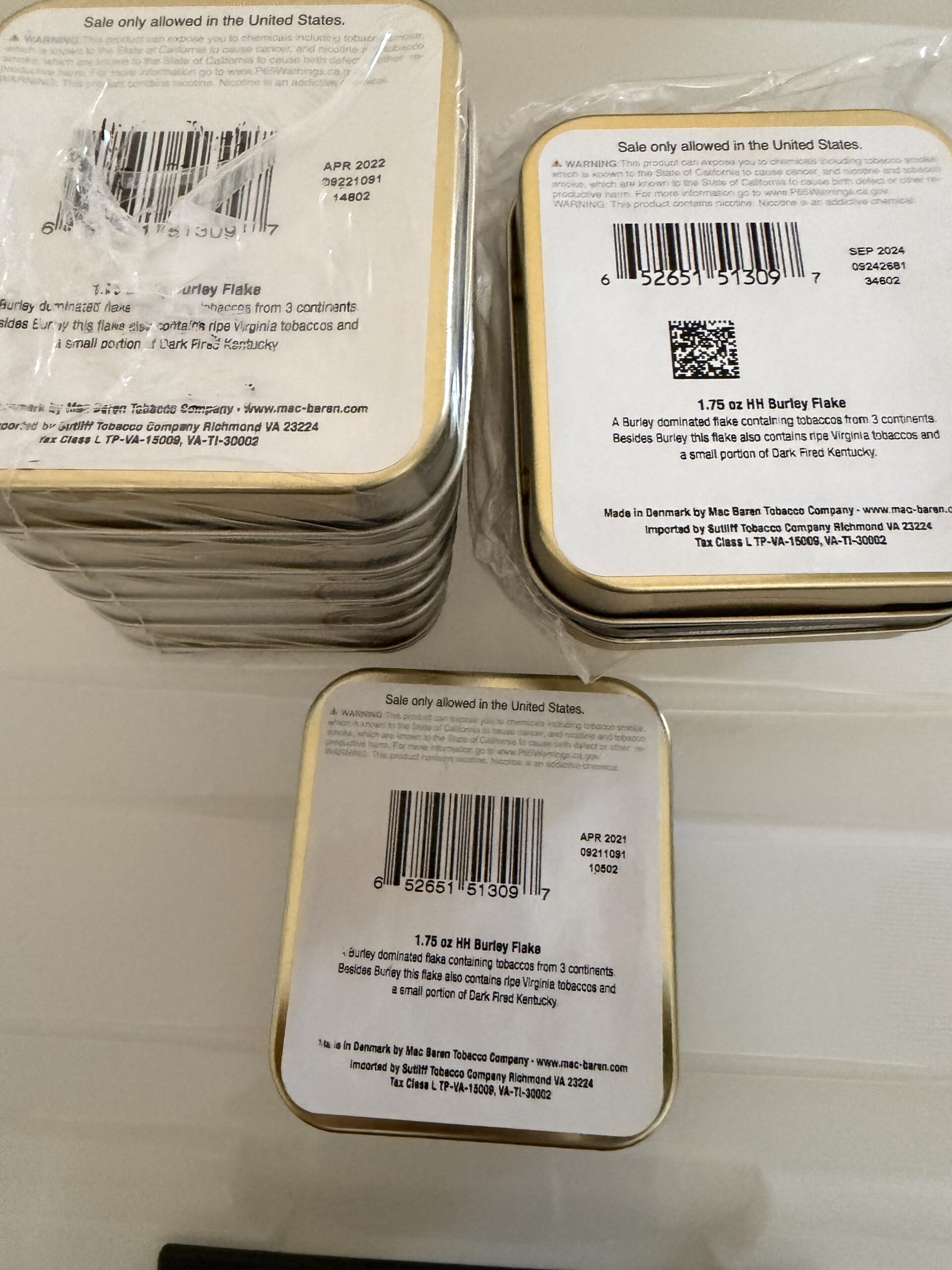 You are bidding on 10 sealed 1.75 Ounce tins of discontinued Mac Baren HH Burley Flake from 2021, 2022 and 2024.