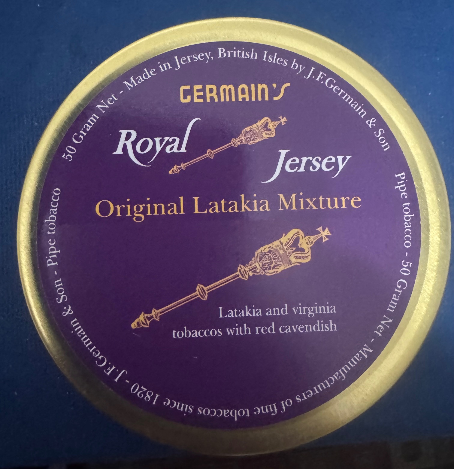 For Germain's Royal Jersey Original Latakia Mixture, selected Virginia and Maryland type tobaccos are carefully blended with a selection of Oriental leaf from Greece and Turkey, and with top grade Latakia. They're specially processed to produce a mellow smoke with rich flavor.