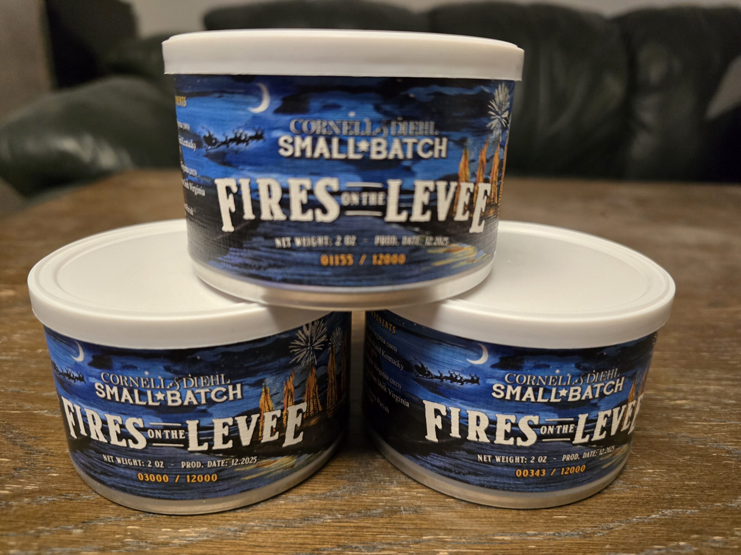 Inspired by the Louisiana Christmas Eve tradition of lighting pyres along the Mississippi river to guide Papa Noël, Cornell & Diehl's Fires on the Levee showcases a selection of naturally sweet, top-tier Virginia grades, anchored by the rich stone-fruit depth of pure St. James Perique from 31 Farms and complemented by the woody, campfire nuances of two exceptional Dark-Fired Kentucky grades.
