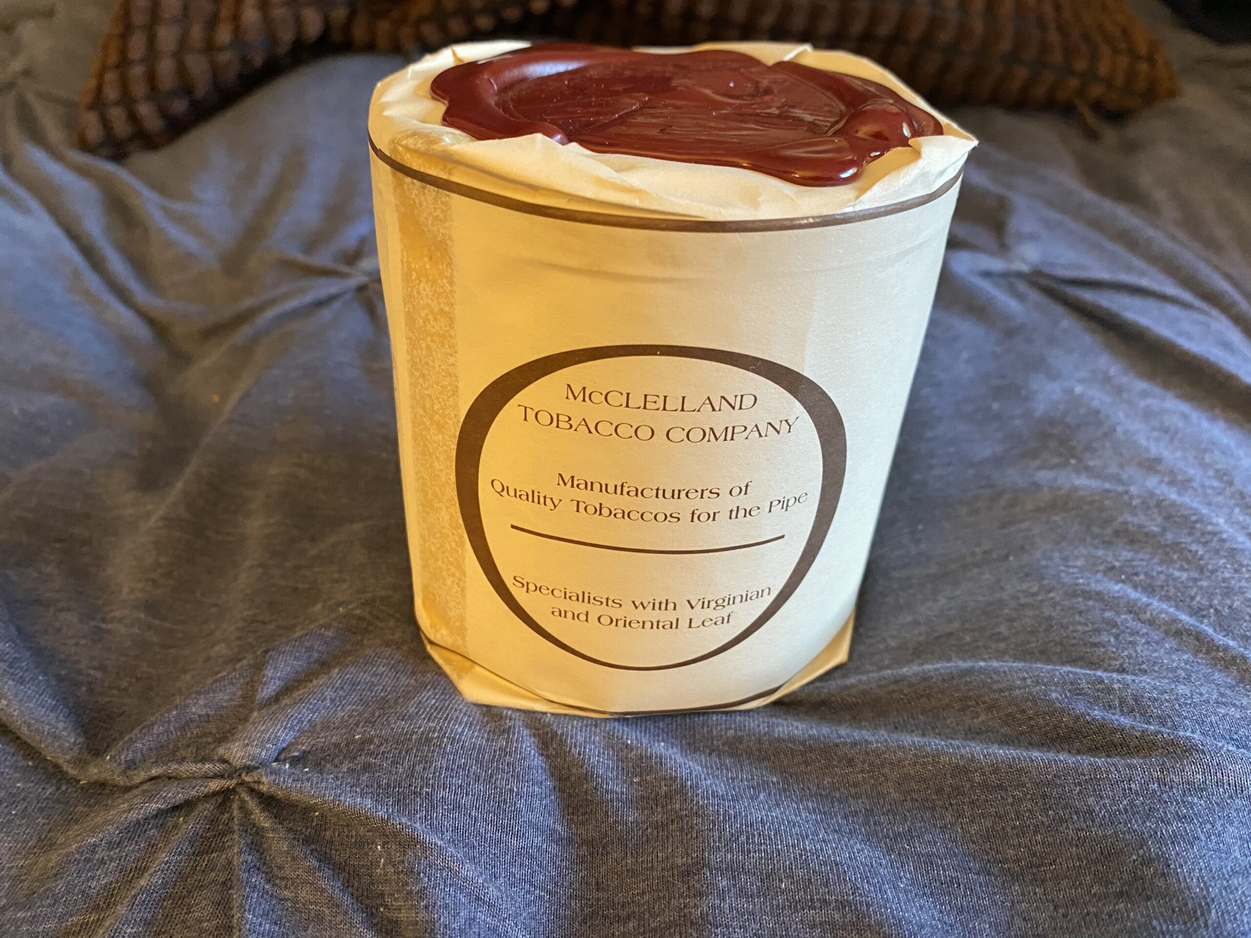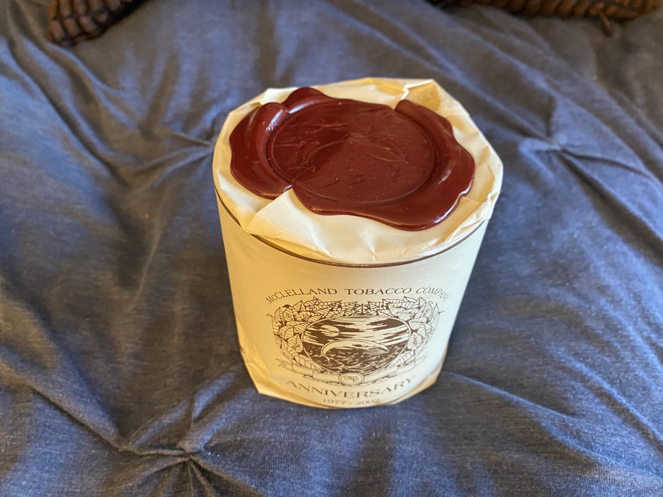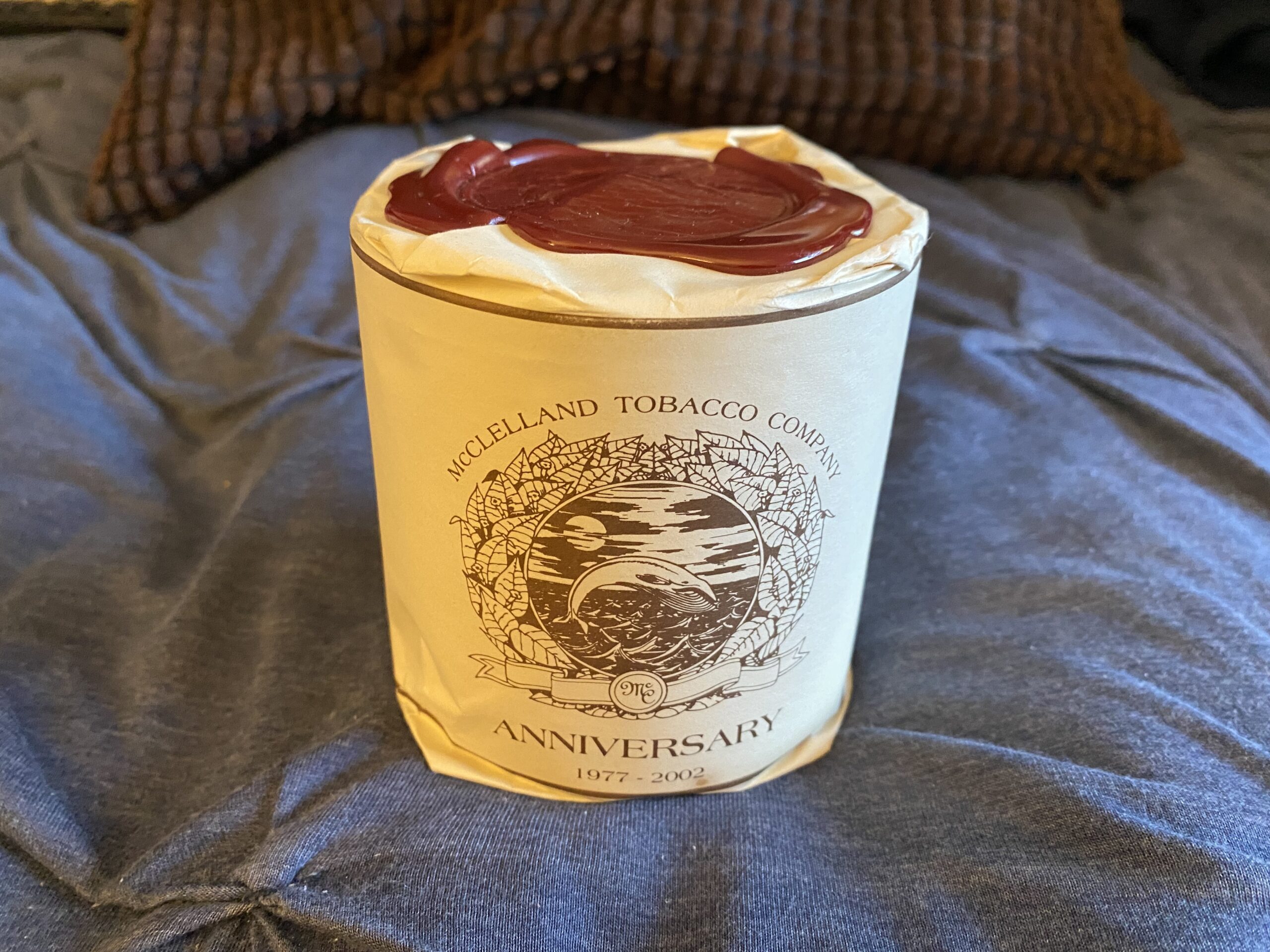 AGED and SEALED tin of McClelland Anniversary Red wax Seal from 2002. 100g tin. - "a matured Virginia blend lightly seasoned with Cyprian Latakia",