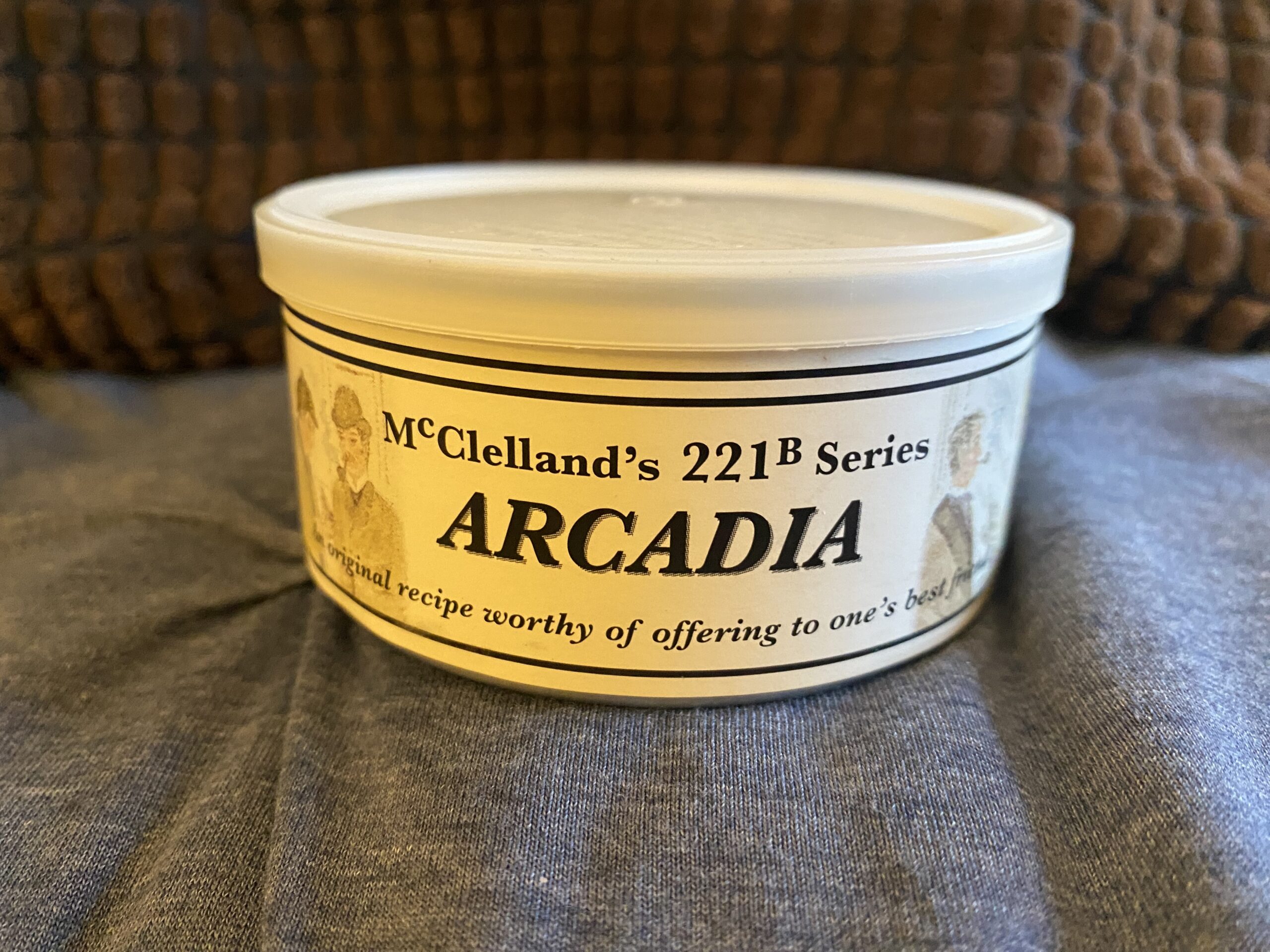 AGED and SEALED tin of McClelland Sherlock 221b series Arcadia. 1999 production. Well aged and ready to enjoy. Original advert included under the lid. Rare find of sealed out of production tobacco.