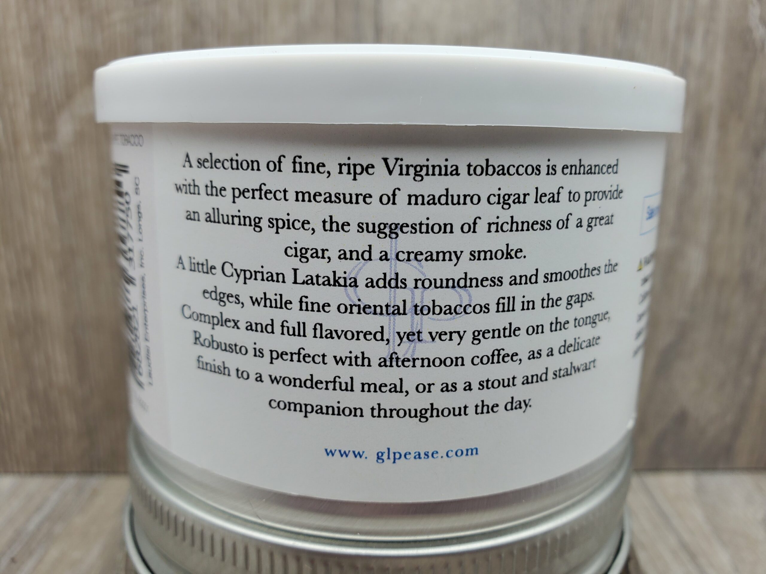 "A selection of fine, ripe Virginia tobaccos is enhanced with the perfect measure of Maduro cigar leaf to provide an alluring spice, the suggestion of the richness of a great cigar, and a creamy smoke. A little Cyprian Latakia adds roundness and smooths the edges, while fine Oriental tobaccos fill in the gaps. Complex and full flavored, yet very gentle on the tongue, Pease's Robusto is perfect with afternoon coffee, as a delicious finish to a wonderful meal, or as a stout companion throughout the day."