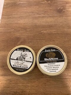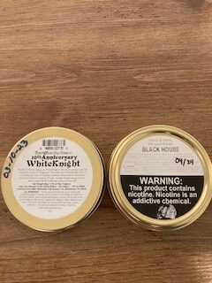 Two Tin combo here. White House is from 2023 and is the Special 10th anniversary blend, meaning the Virginias had been aged for 10 years before going into the tin- from 2013, the first year White Knight was produced. Black House is from 2024. Sutliff is no more and neither are these Hearth and Home homages to Balkan Sobranie (White Knight) and Balkan Sobranie 759 (Black House). No Reserve. Happy Bidding.