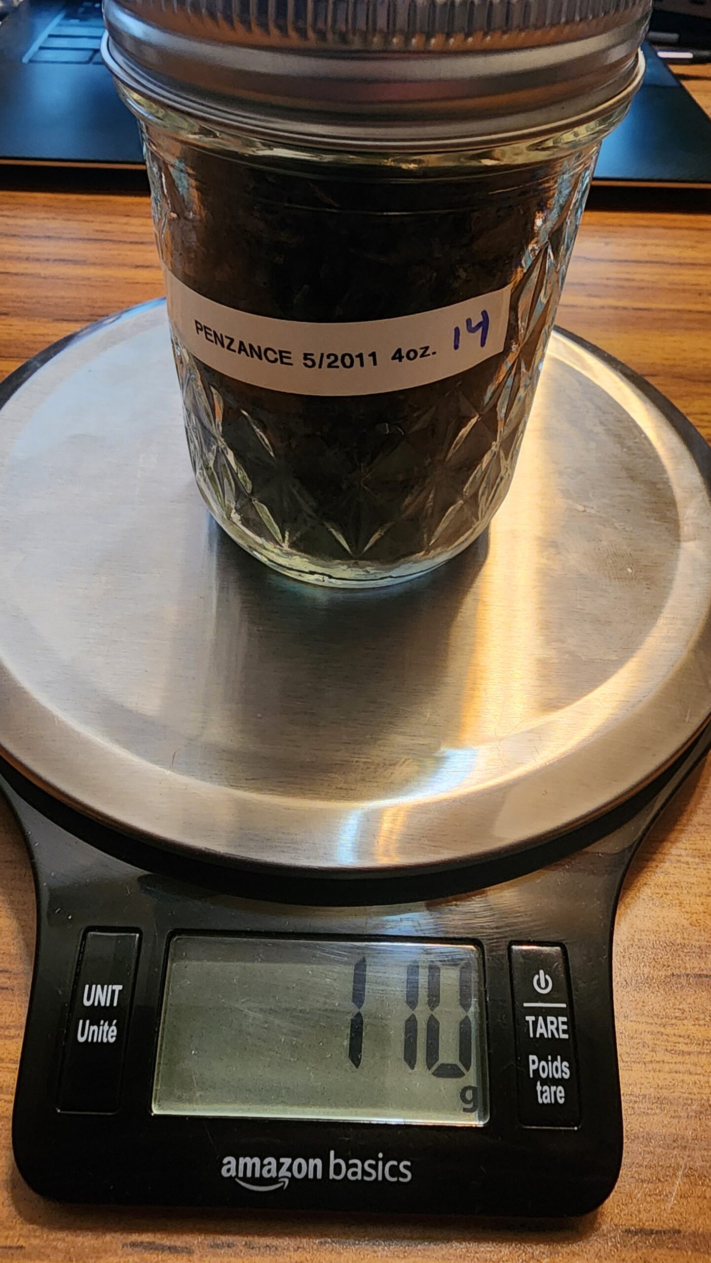 This is the real deal. I have a few jars of Penzance from 2011 that are in immaculate condition. In my experience with hundreds of Ball jars, they are way more reliable for long term storage than mylar or tins. I just opened one a couple months ago and it was sublime! This jar has been resting in a dark cabinet its whole life, unopened, waiting for someone who can appreciate it to its fullest. Take a look at the closeup - the tobacco is in immaculate condition!The jar contains 110 grams of Penzance, the equivalent of 2.2 50g tins.