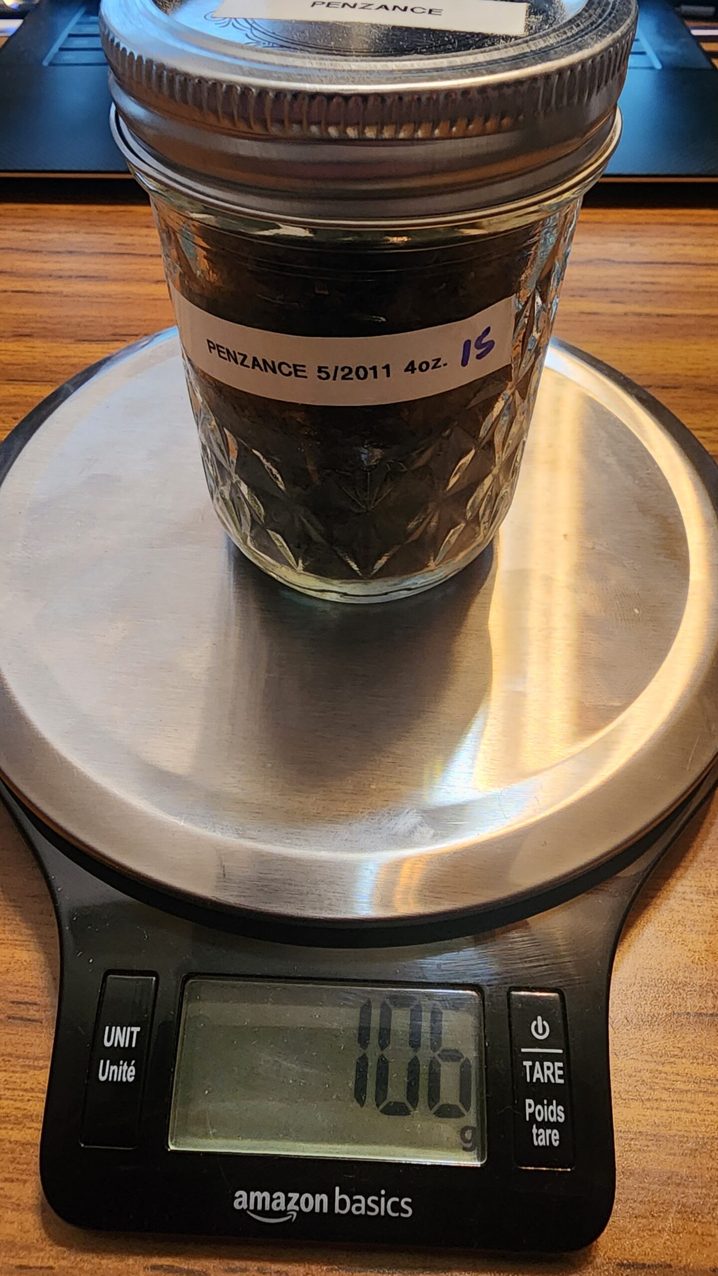 This is the real deal. I have a few jars of Penzance from 2011 that are in immaculate condition. In my experience with hundreds of Ball jars, they are way more reliable for long term storage than mylar or tins. I just opened one a couple months ago and it was sublime! This jar has been resting in a dark cabinet its whole life, unopened, waiting for someone who can appreciate it to its fullest. Take a look at the closeup - the tobacco is in immaculate condition!The jar contains 106 grams of Penzance, the equivalent of 2.1 50g tins.