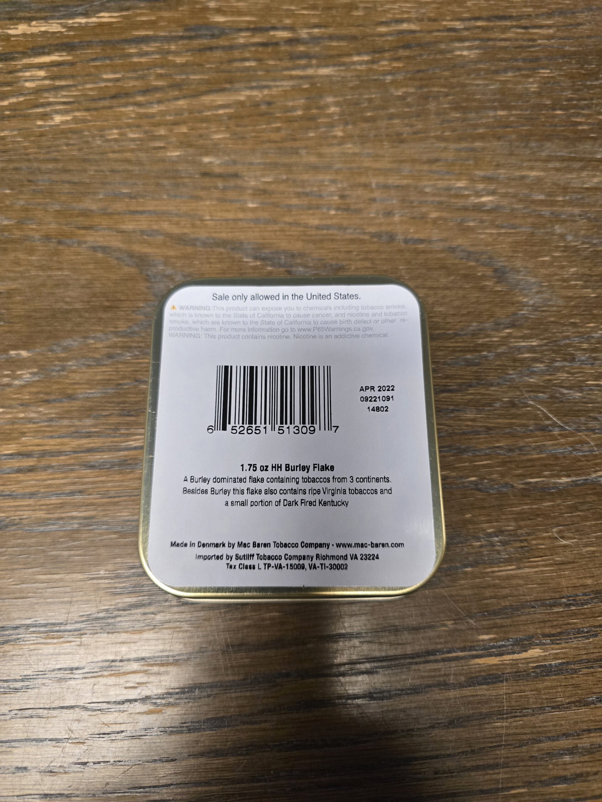 2022 Mac Baren HH Burley Flake - 1 Tin NR BIN $60