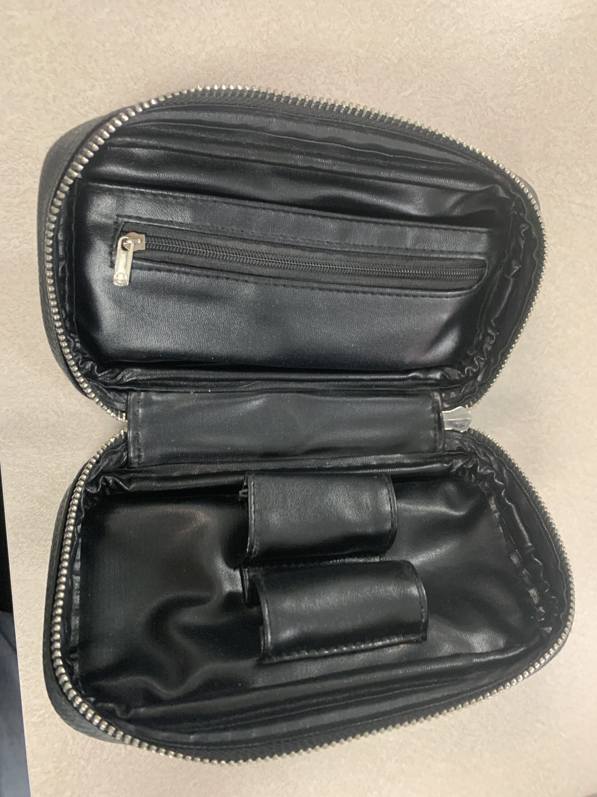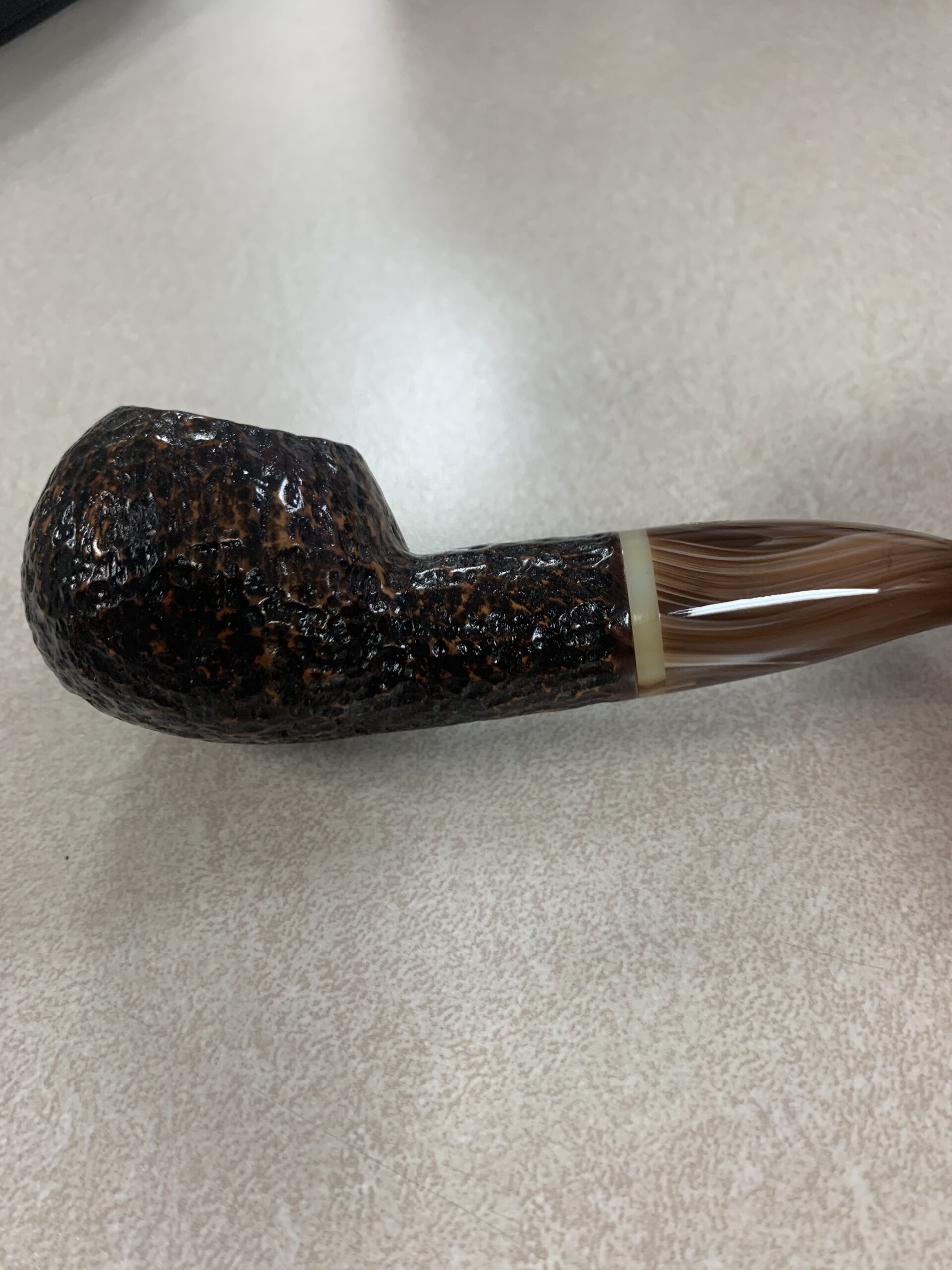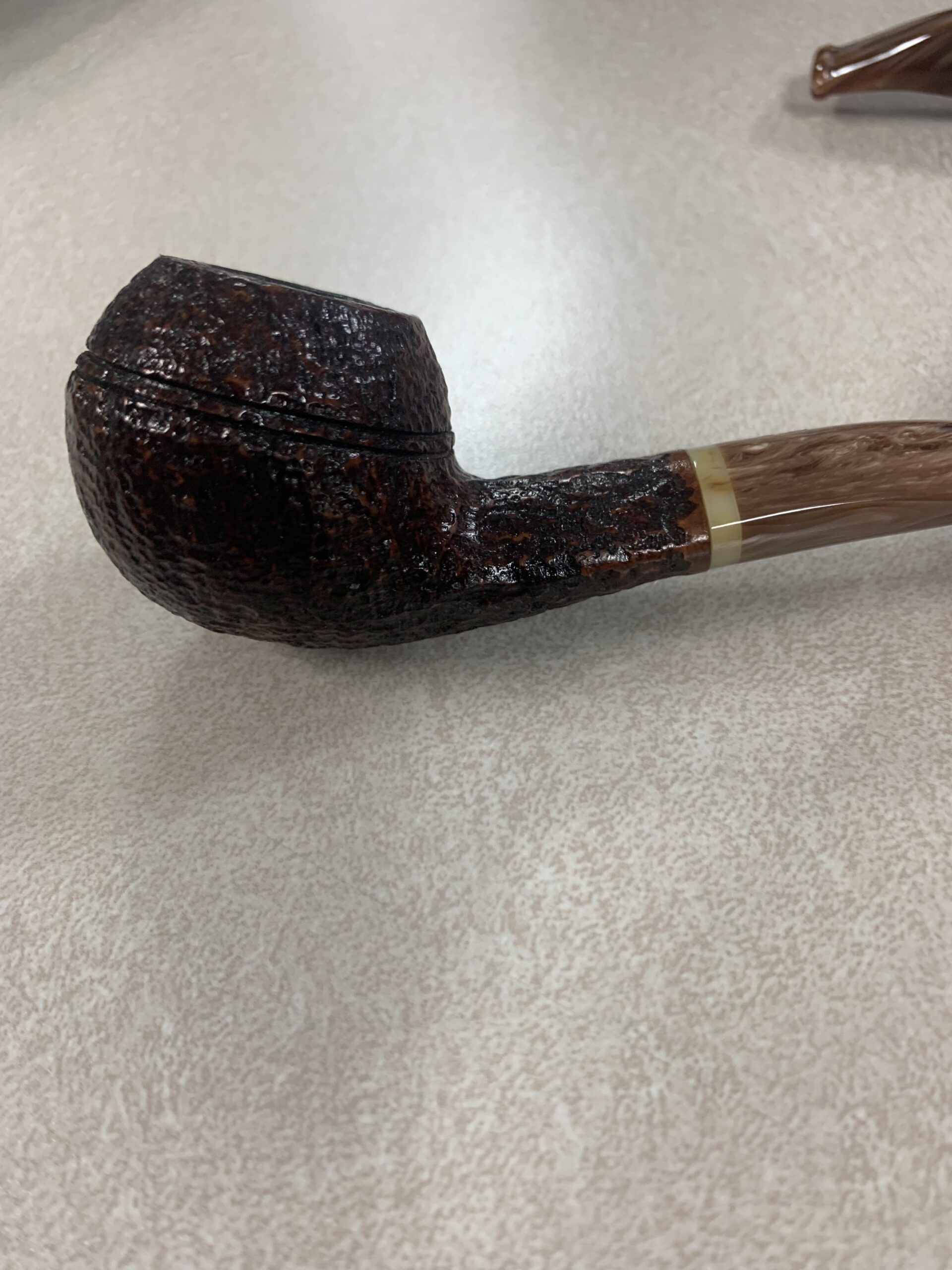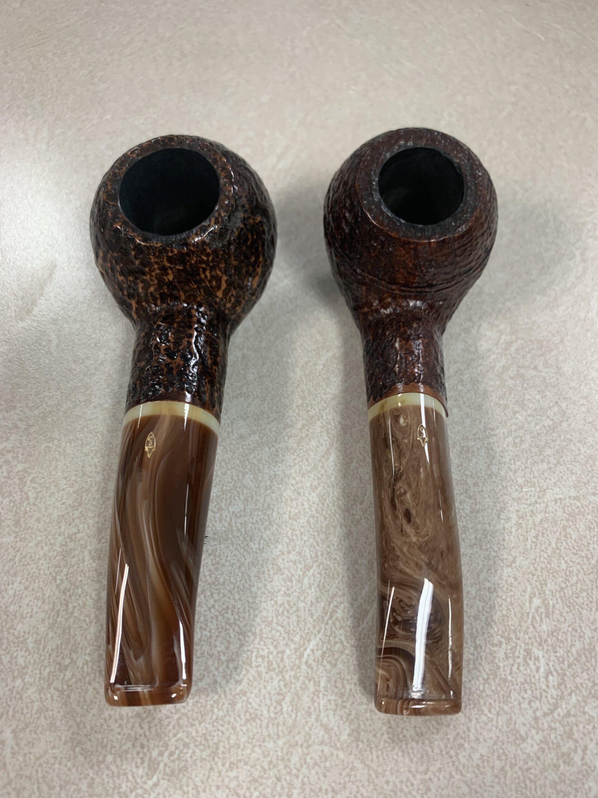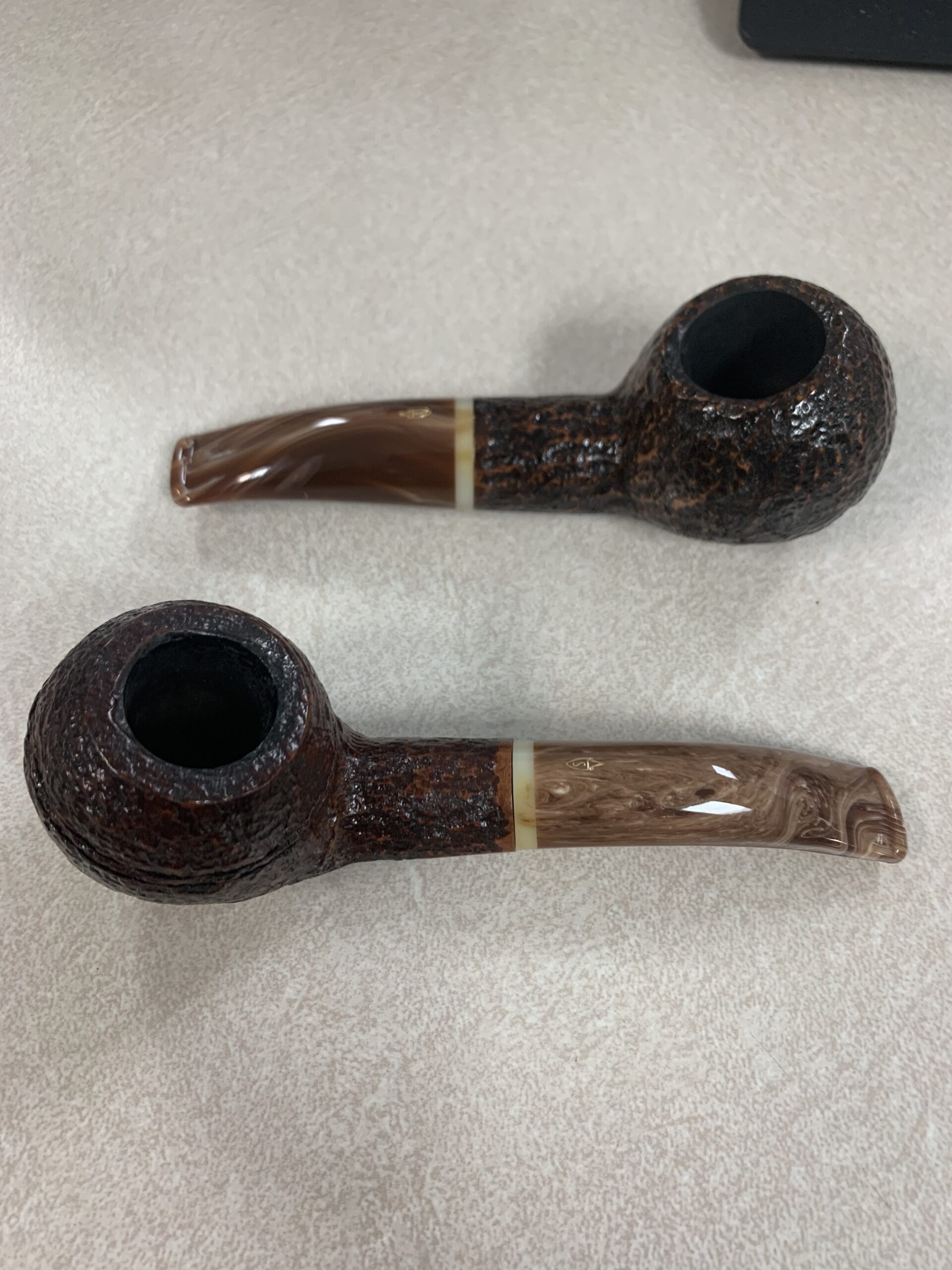 This is a rare pair of Savinelli Dolomiti rusticated set. This set consists of the 673KS Rhodesian with rings ( no longer made) and a 320KS Author shape. The Dolomiti in the light brown rustication is no longer produced and both pipes are lightly smoked and in excellent condition. This set also comes with a Scottie leather two pipe zipper bag. This is a beautiful and perfect combination set to take anywhere and allows for one aromatic and one of your choice blends to smoke. This makes the best on the go bag everyday set up. Both pipes have a melange acrylic stem is great condition. This set is your best essential set up for any pipe smoker either new or seasoned.
