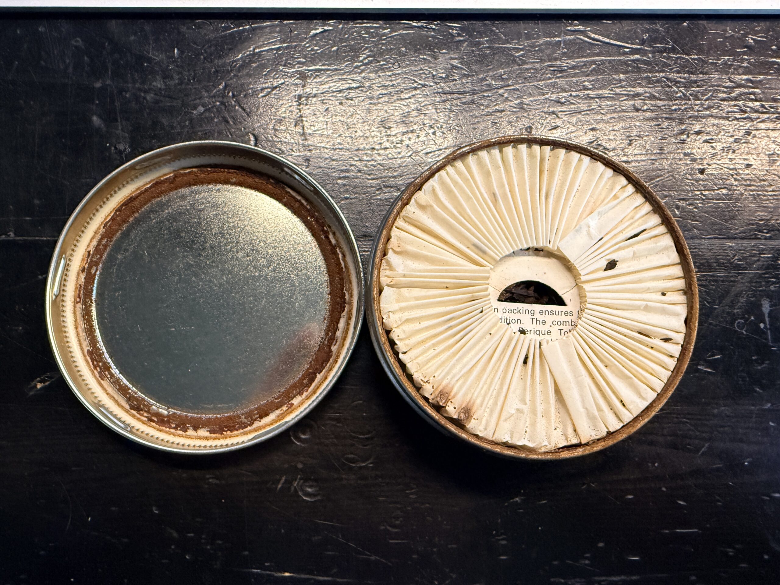 Rare. Full tin. Made in the U.K. Tin has shelf wear. Tin contents are undisturbed, but seal is compromised. Will require rehydration.