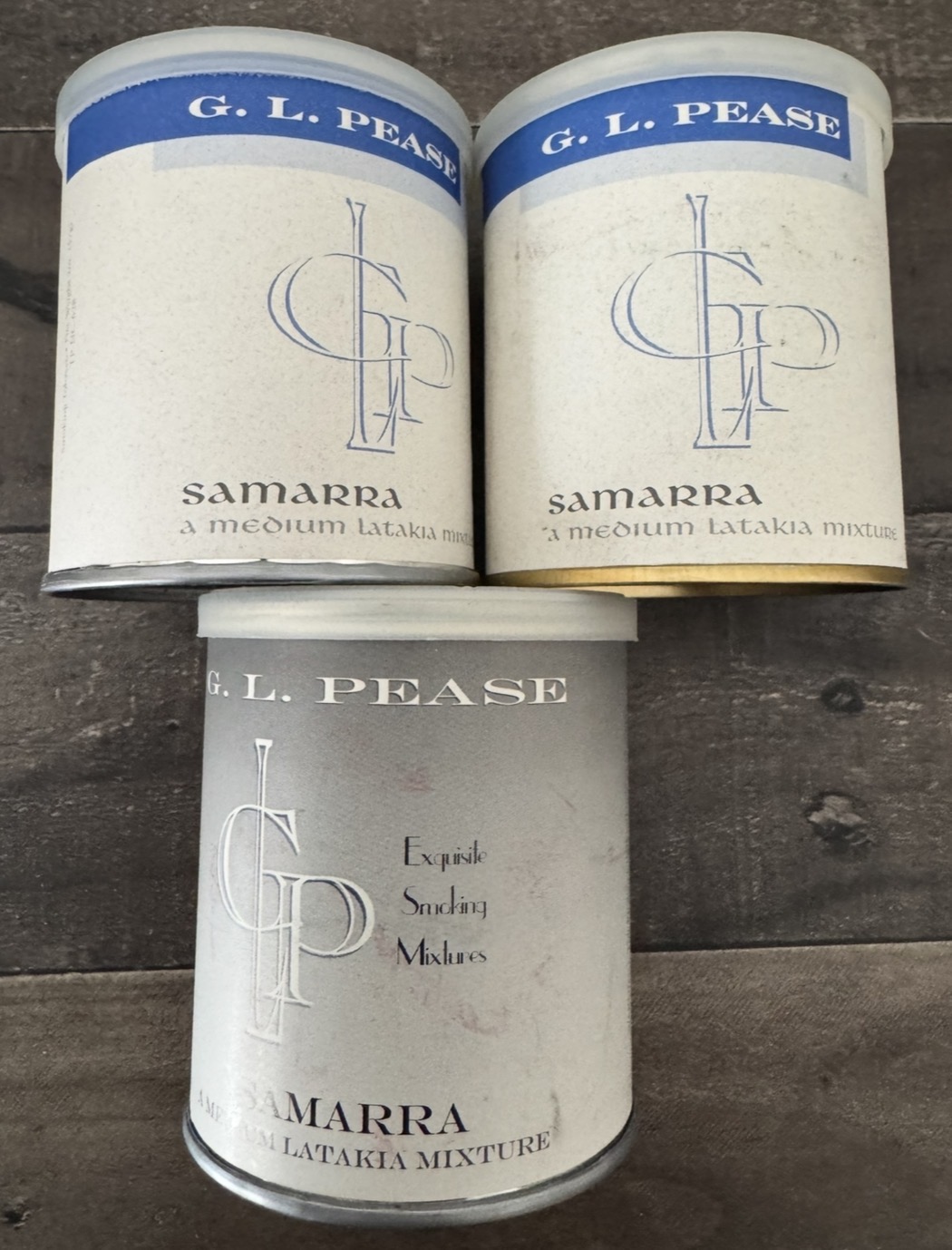 Three 2 oz tins of Samarra tobacco, a medium Latakia mixture from G. L. Pease. This tobacco has been stored in a cooler for over 25 years!!! WOW!!!!
