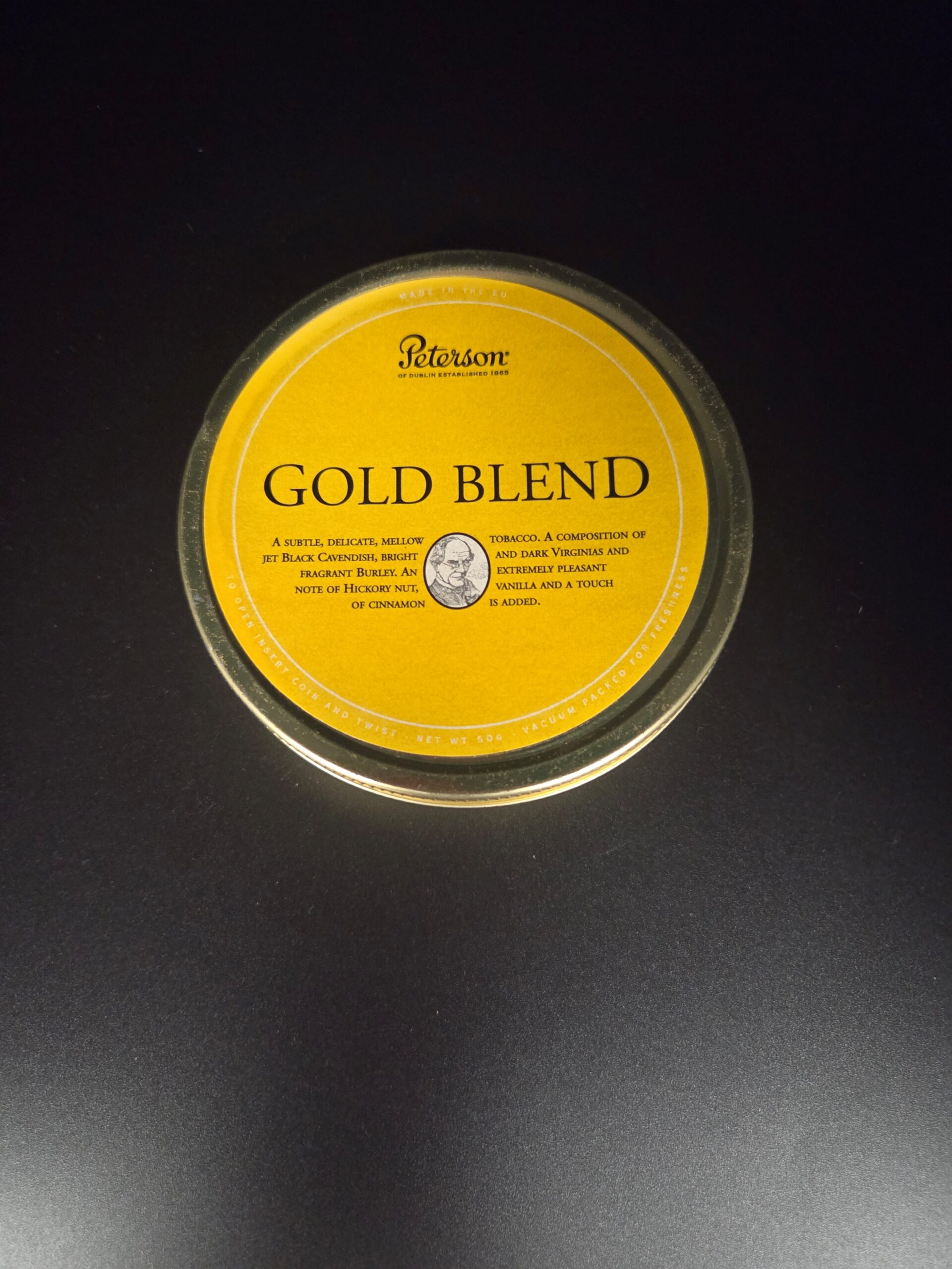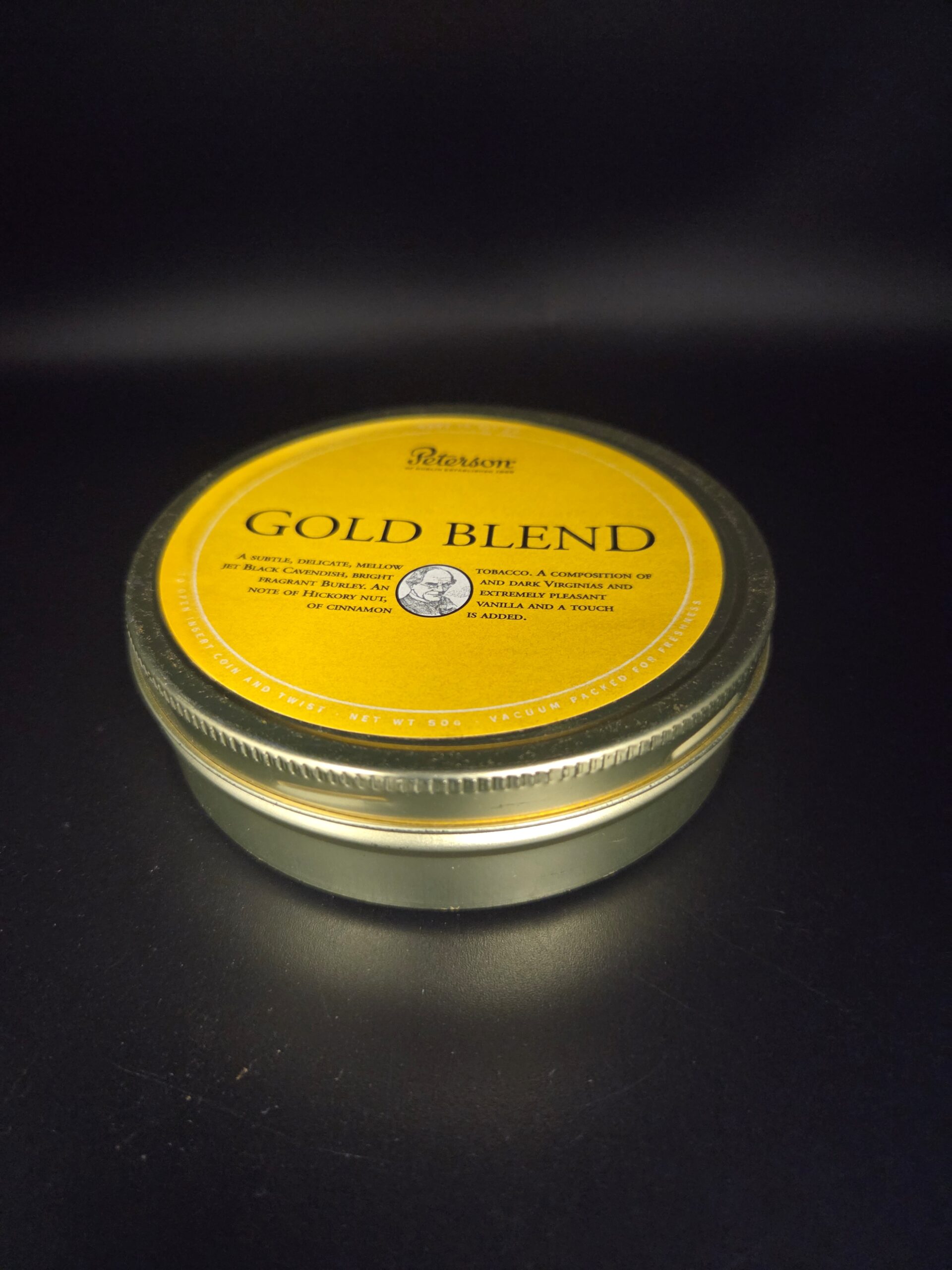 1 X 50g tin of Peterson Gold Blend. Expect a composition of jet Black Cavendish, bright and dark Virginias, and fragrant Burley with an extremely pleasant note of Hickory Nut, Vanilla and a touch of Cinnamon. New and unopened condition. Vacuum packaged and sealed for freshness. Stored since purchase in a climate controlled location.