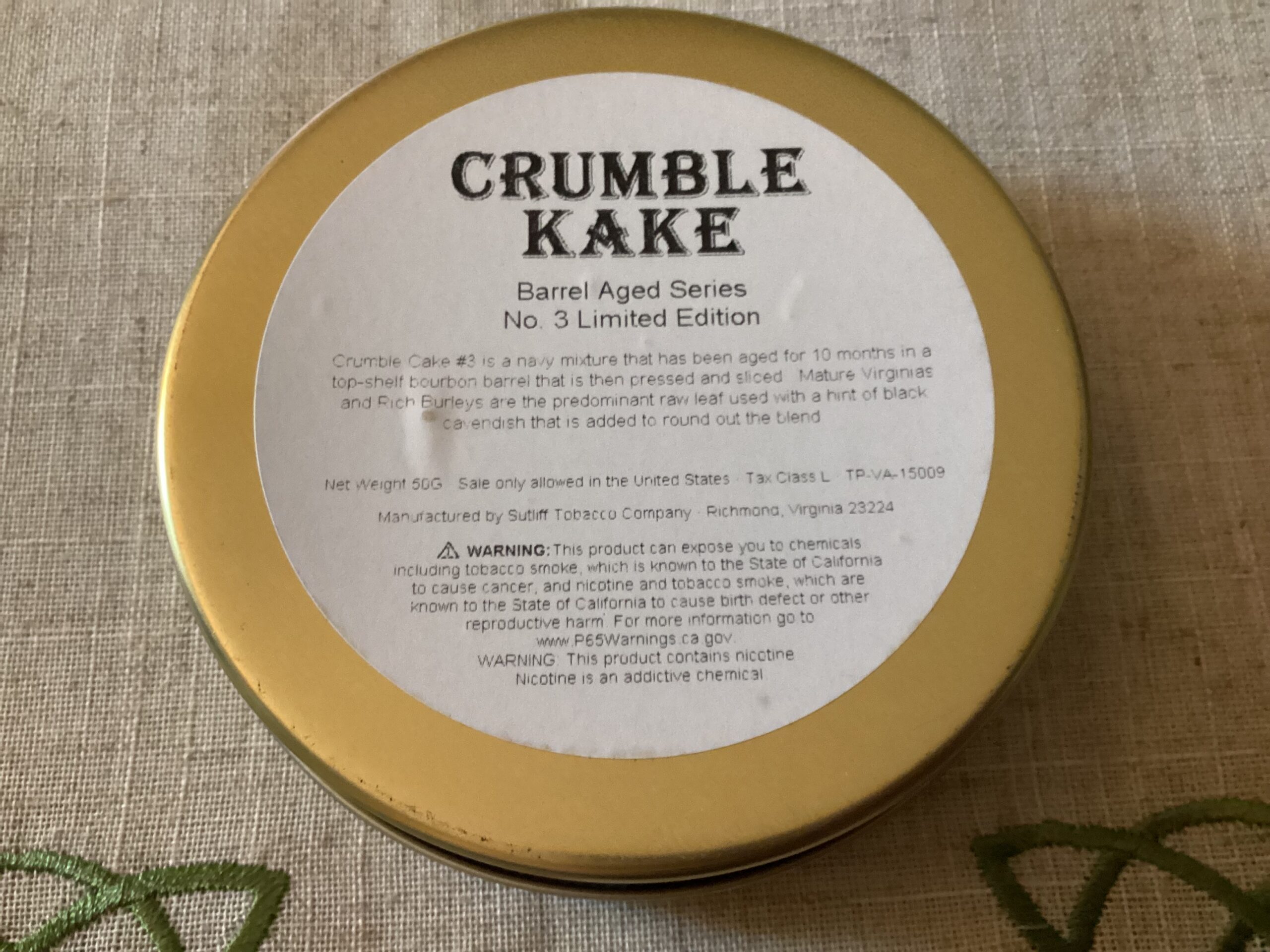 This is a limited-edition tobacco from Sutliff that shows that they know how to be creative. Sutliff Crumble Kake No. 3 Navy begins with select Virginias, mellow Burleys, and toasty black Cavendish. Usually, a navy flake or cake is made with a rum topping, but in this case, the tobaccos are loaded into a top-shelf Bourbon barrel and aged to allow the essence of the spirits to infuse the leaf with the sweet and tangy flavor. Then, the tobacco is pressed into crumble cakes and sliced into easy-to-prepare pieces.