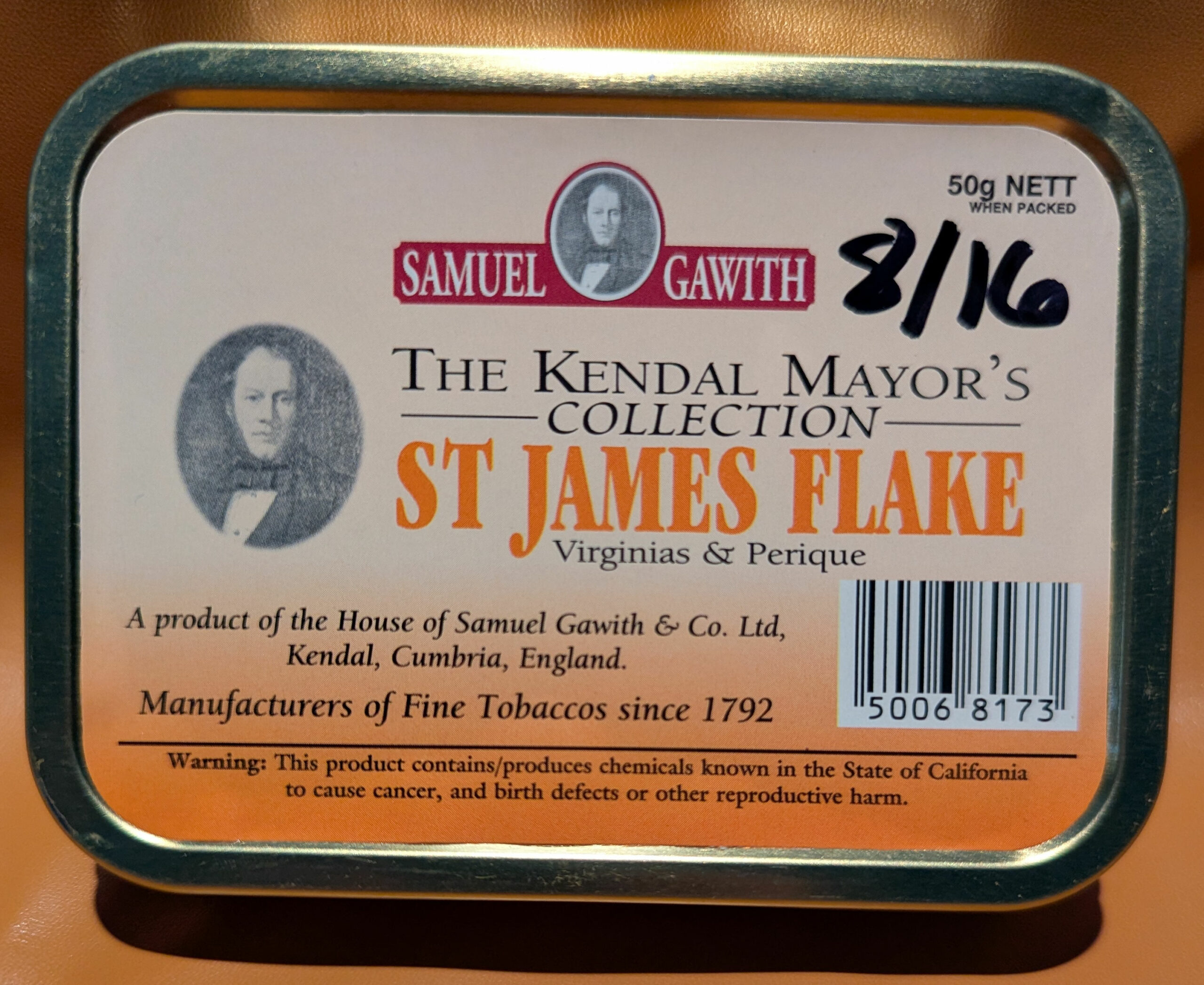 With age, St. James Flake transforms into a deeper, richer, and smoother smoke, with the bright Virginia citrus notes darkening into stewed fruits (like raisins, figs and prunes) and the spicy Perique maturing into a refined, mellow pepper. After 10 years, this is truly a treat!