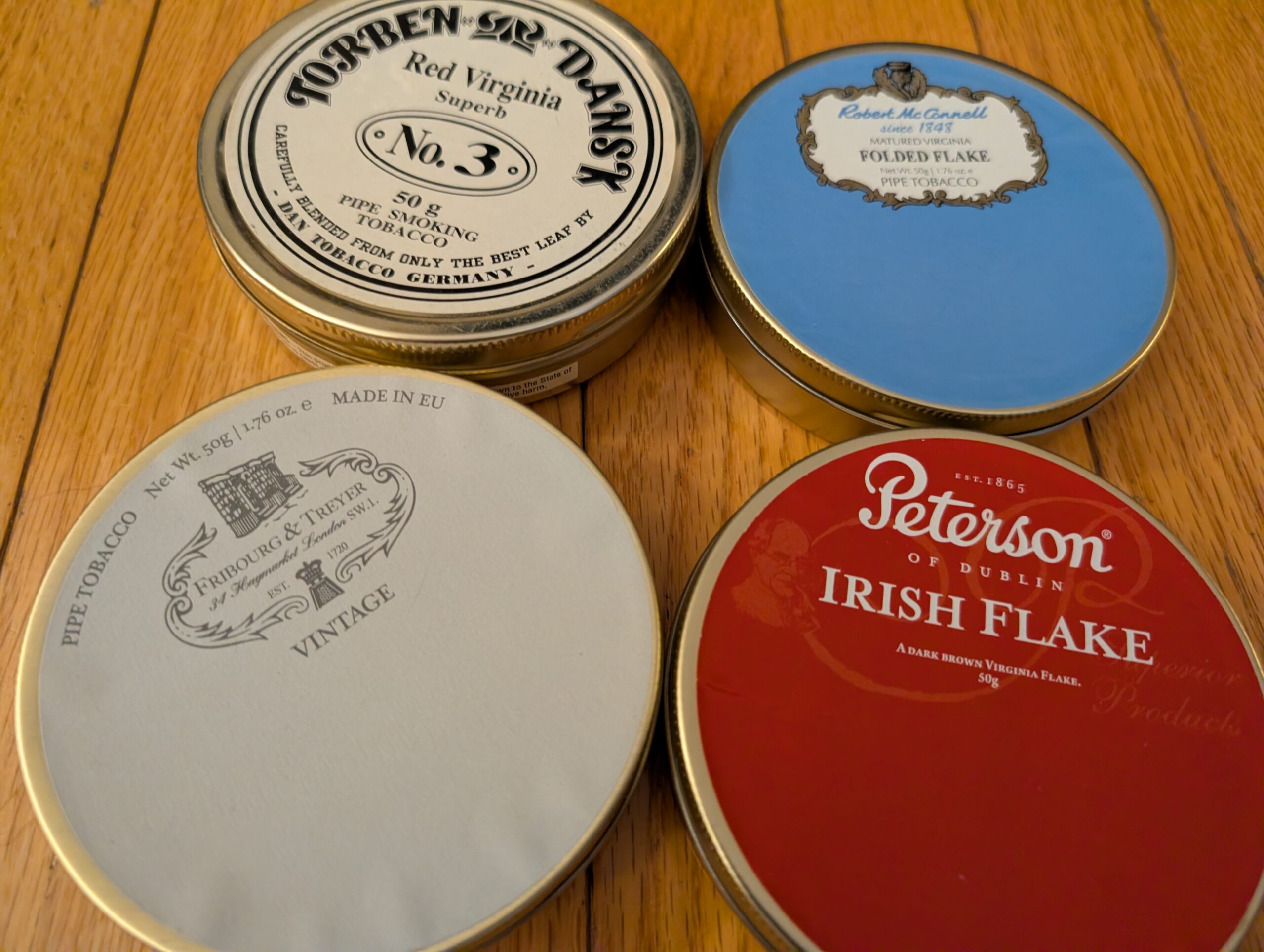 4 tin sample pack Torben Dansk No. 3 Red Virginia, Fribourg Vintage Flake, Irish Flake, Folded Flake