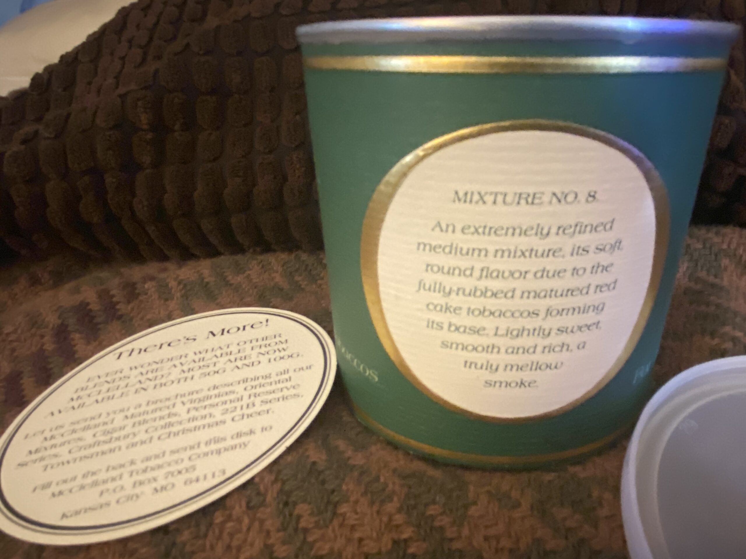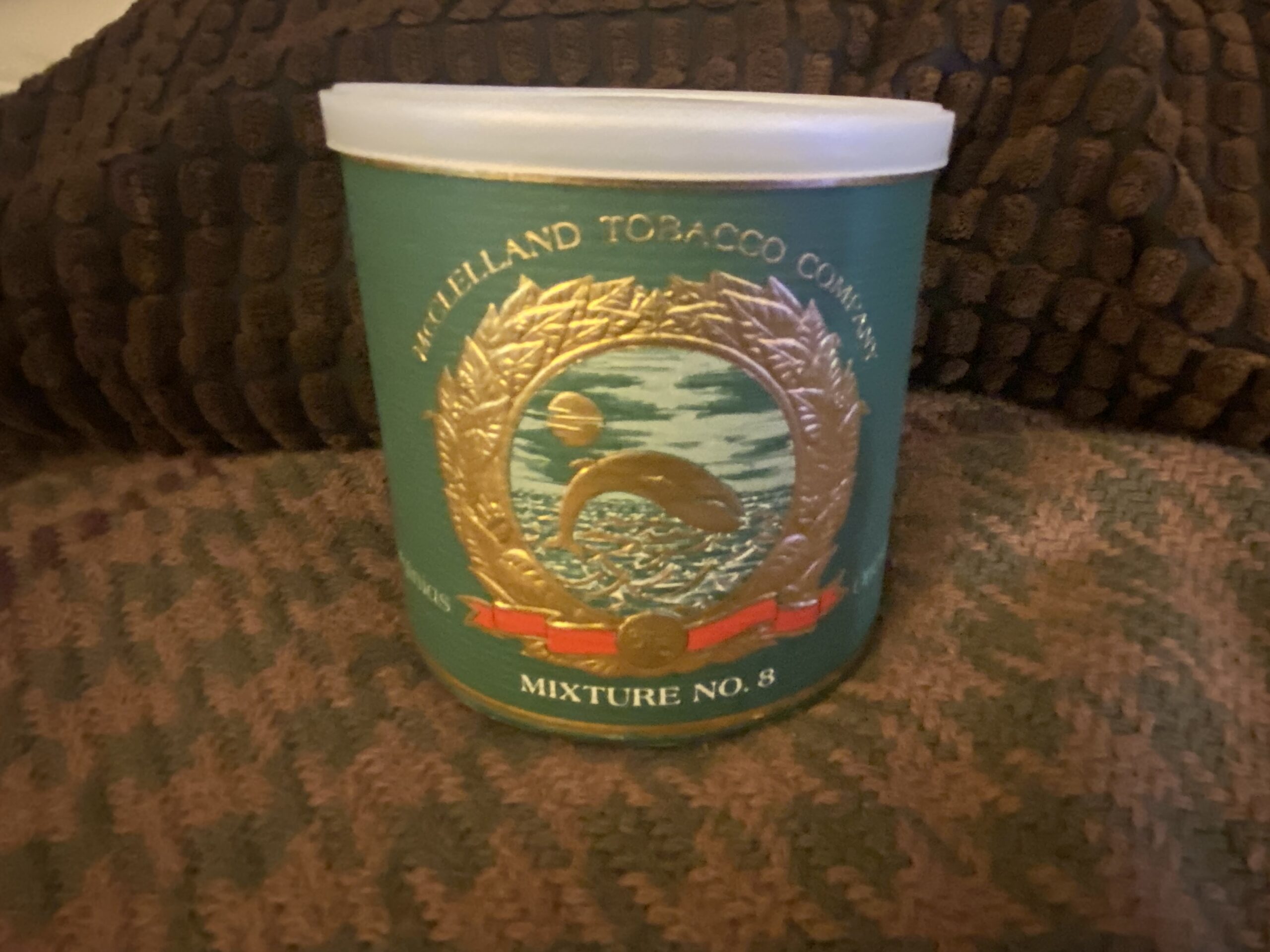 AGED and SEALED tin of McClelland Mixture No. 8. 1998 production. Well aged and ready to enjoy. Original advert included under the lid. Rare find of sealed out of production tobacco.