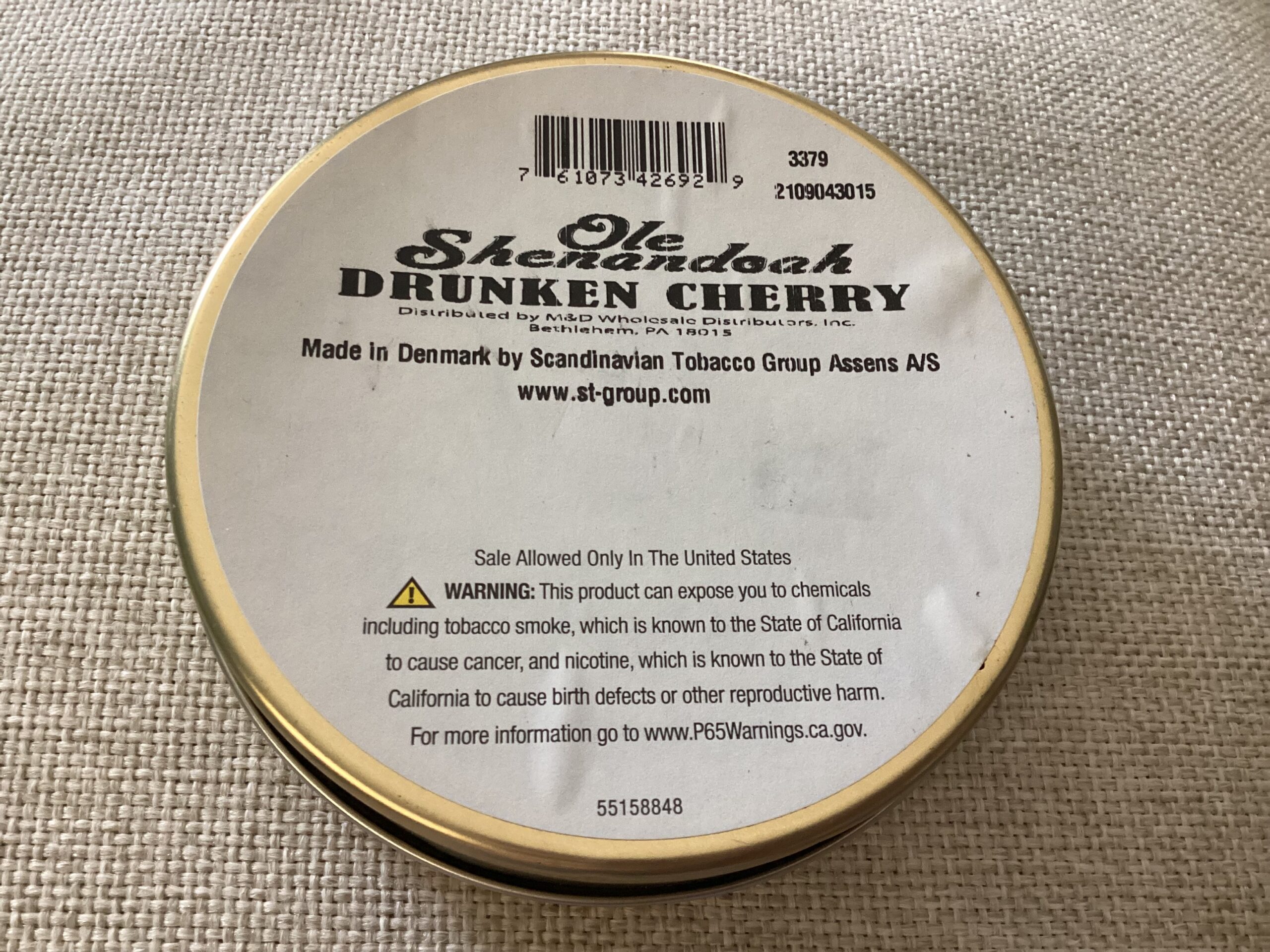 Discontinued. Ole Shenandoah Drunken Cherry Pipe Tobacco 50g flat tin. An aromatic blend containing black cavendish, burley, and Virginia. Sealed in undented tin. Previously produced as “Bootlegger”.