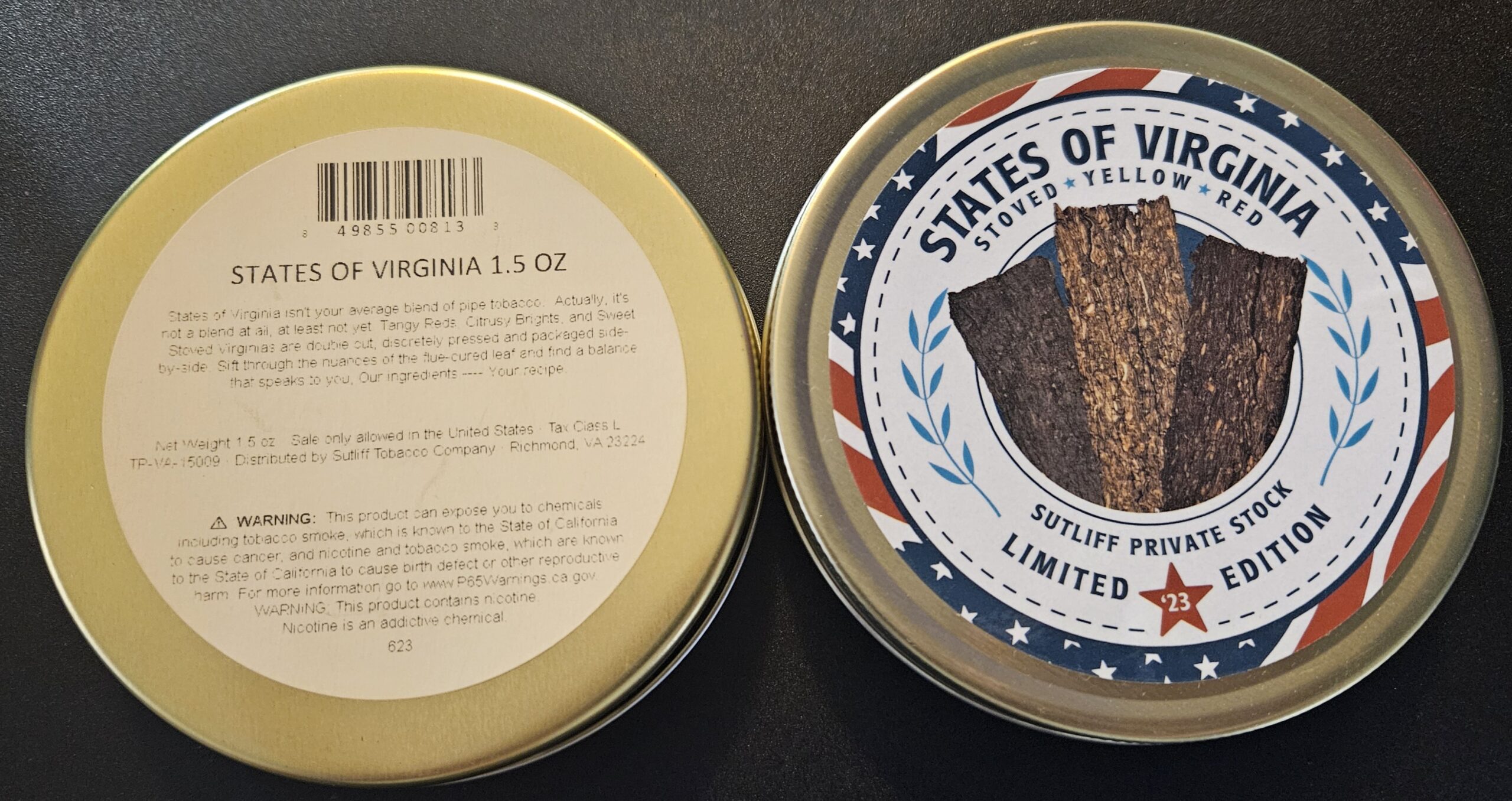 Per Tobacco Reviews: State of Virginia isn't your average blend of pipe tobacco. Actually, it's not a blend at all, at least not yet. Tangy reds, citrusy brights, and sweet stoved Virginias are double cut, discretely pressed and packaged side by side. Sift through the nuances of the flue-cured leaf and find balance that speaks to you, Our ingredients ----Your recipe.