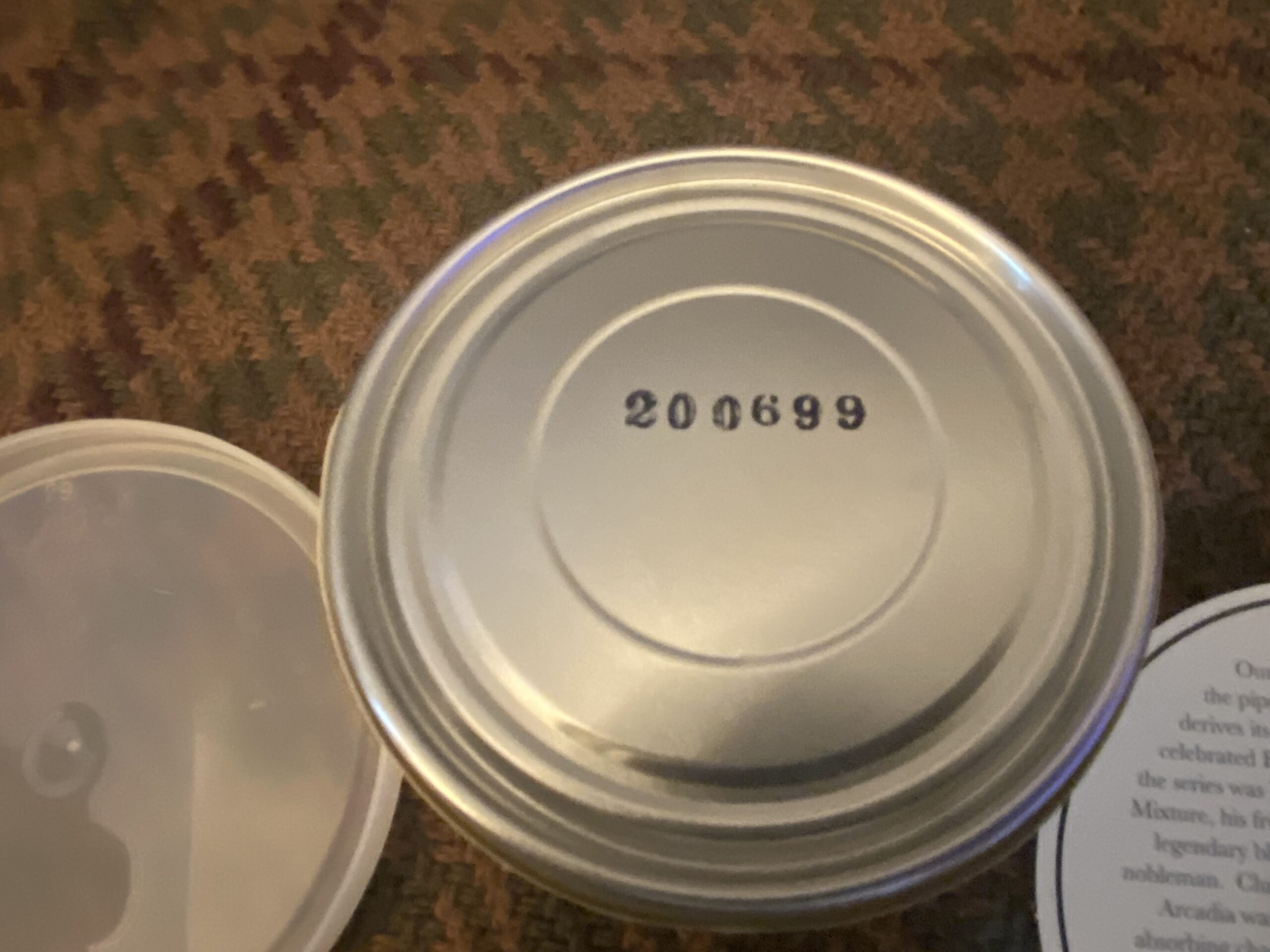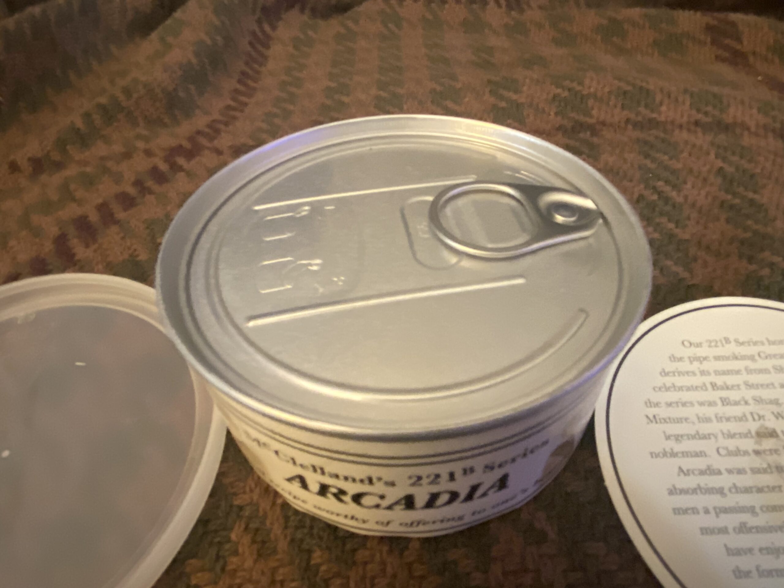 This collection is dwindling. Only one more can of Arcadia after this one. AGED and SEALED tin of McClelland Sherlock 221b series Arcadia. 1999 production. Well aged and ready to enjoy. Original advert included under the lid. Rare find of sealed out of production tobacco. Small dent in can on back label can be seen in pic - does not affect seal.