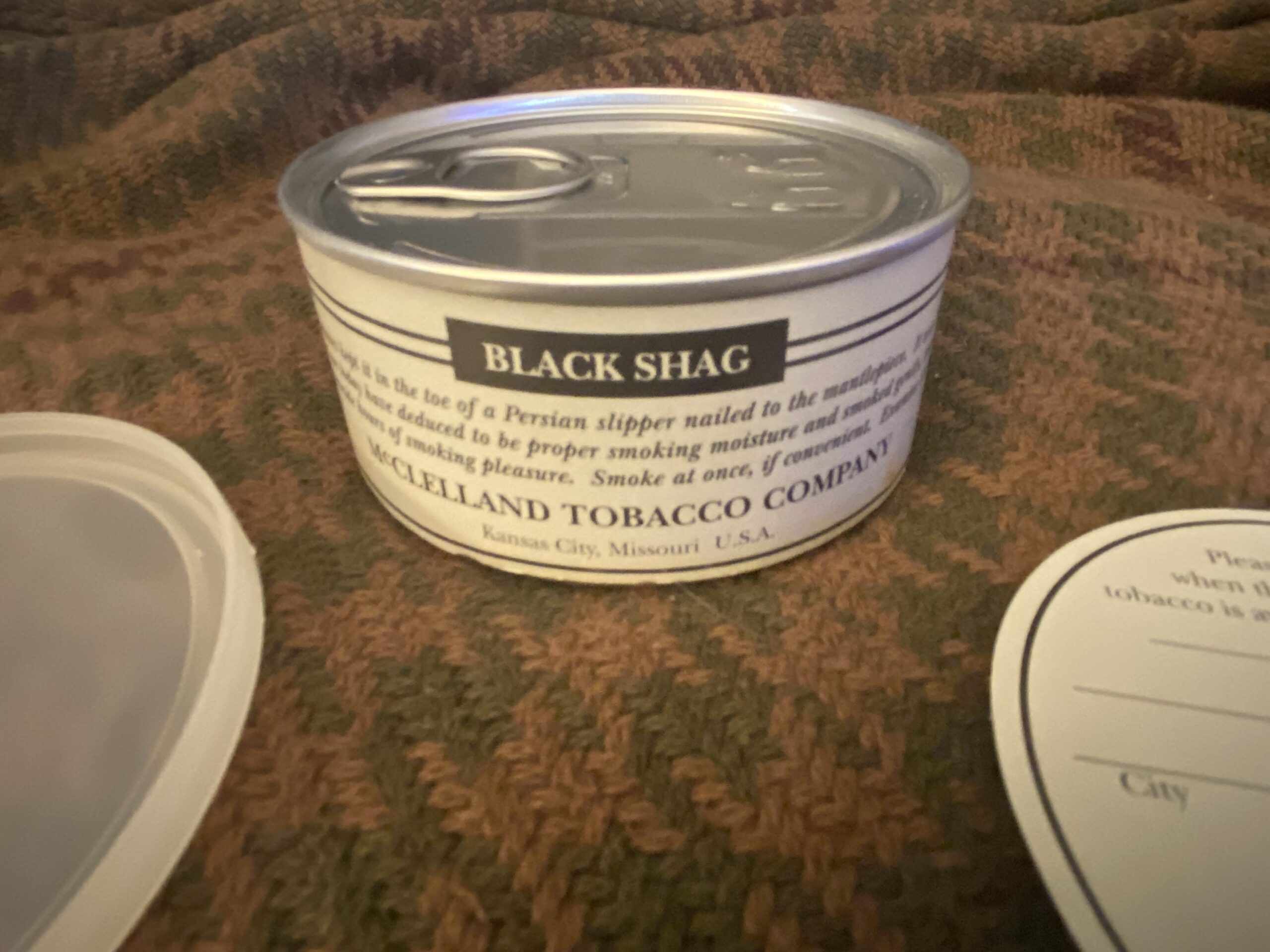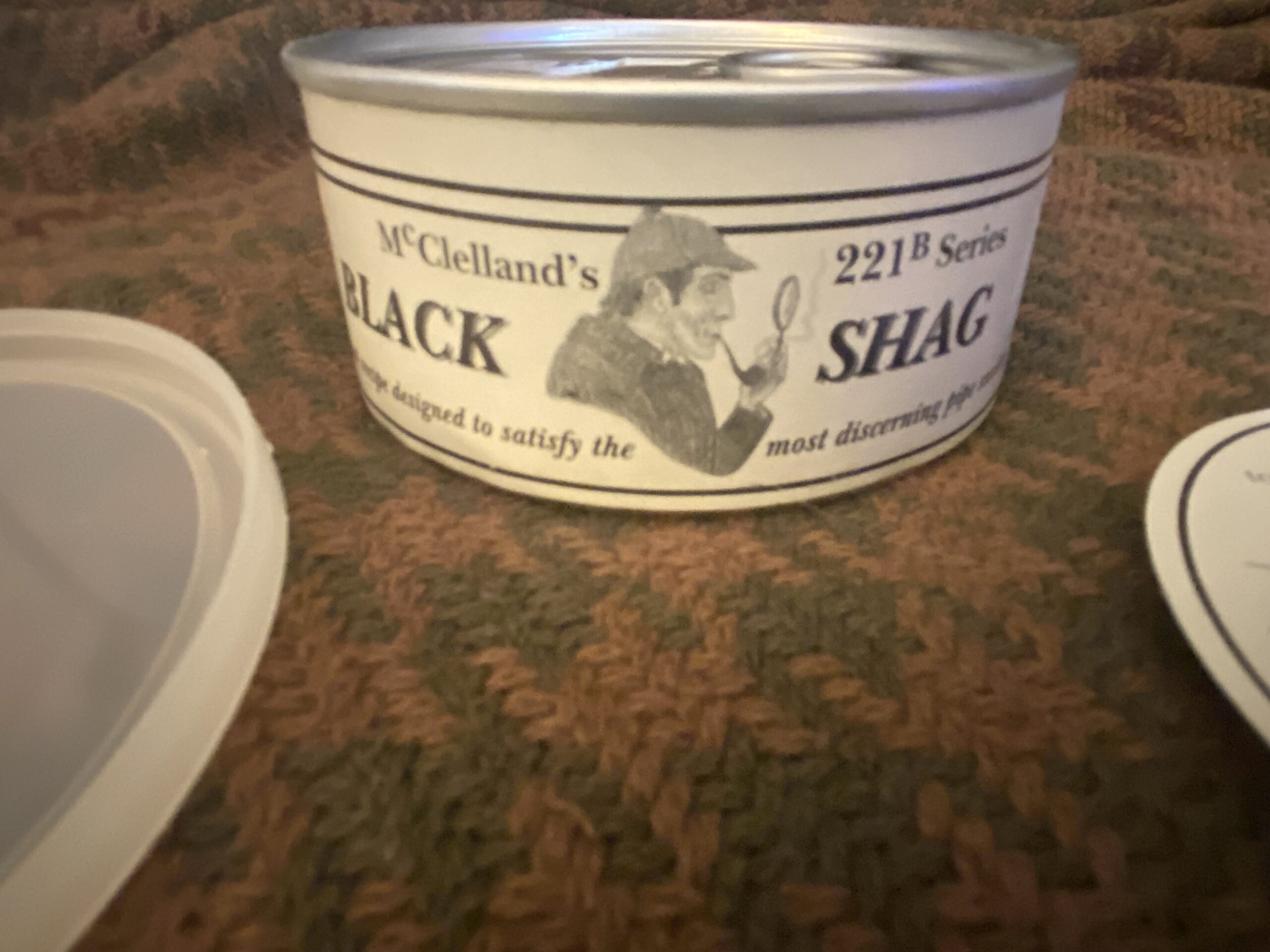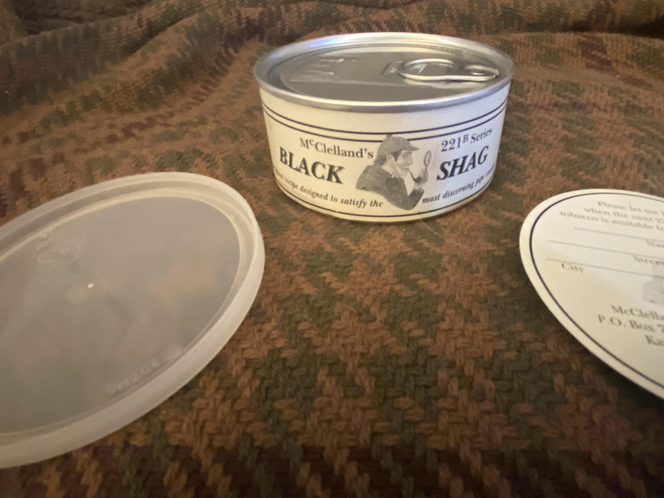 My last tin of Black Shag all from the same collection- AGED and SEALED tin of McClelland Sherlock 221b series black shag. 1998 production. Well aged and ready to enjoy. Original advert included under the lid. Rare find of sealed out of production tobacco.