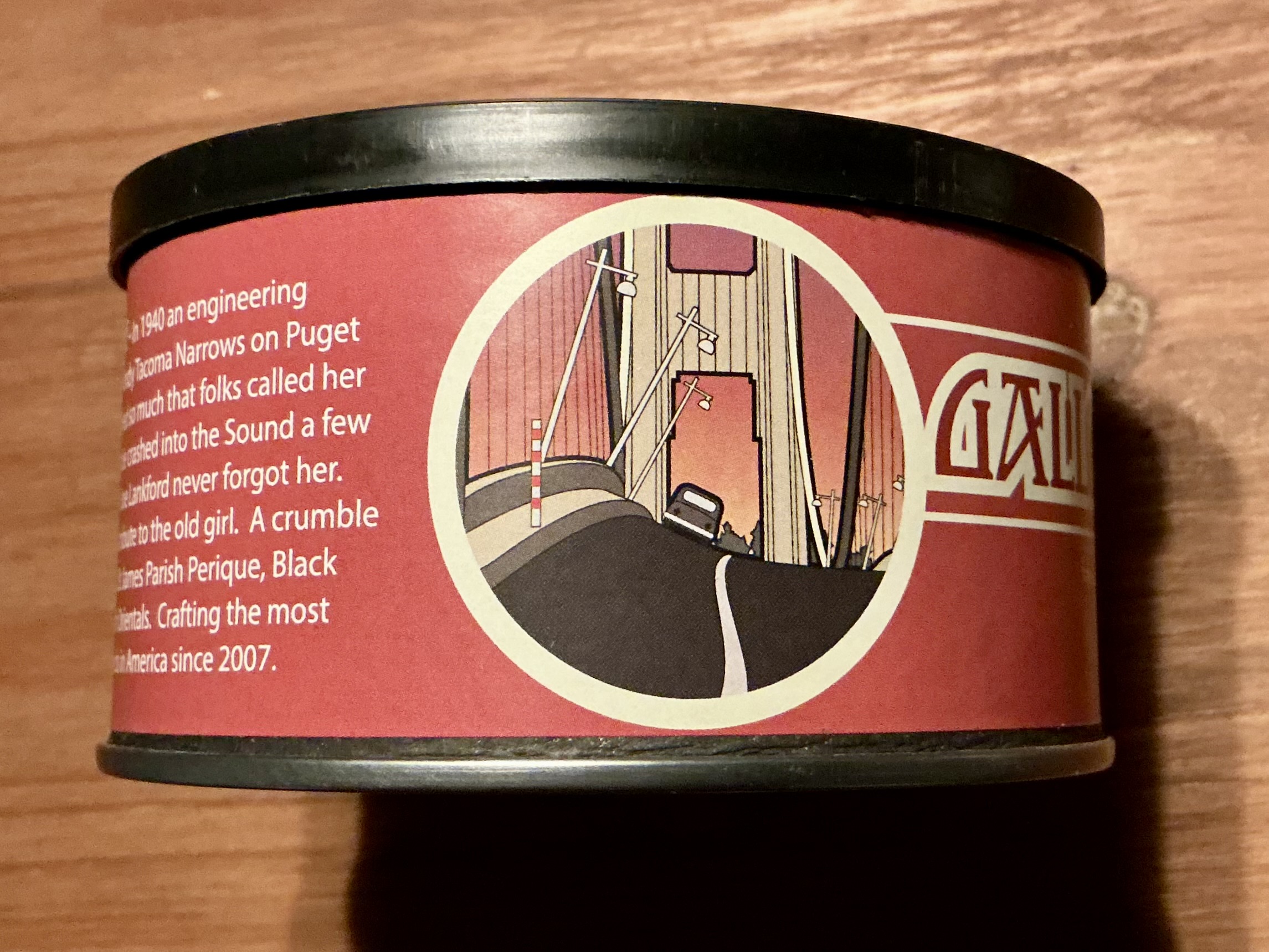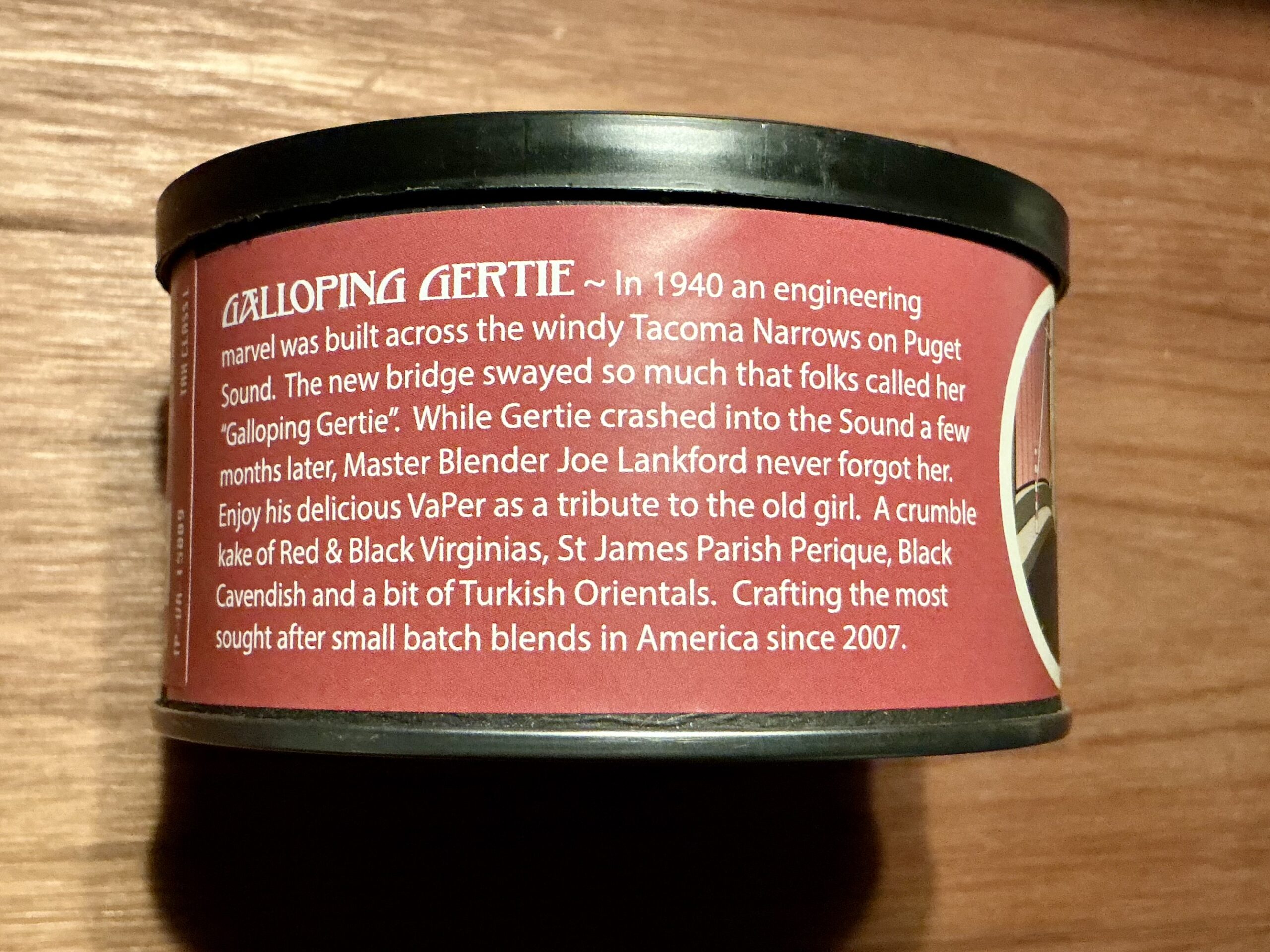 Seattle Pipe Club's Galloping Gertie take its name from the 1940 Tacoma Narrows Bridge that spanned the Tacoma Narrows Straight in Puget Sound and collapsed just four months after it opened due to aeroelastic flutter caused by high-speed winds. Seattle Pipe Club's tribute to the ill-fated bridge is a crumble cake of red and black, stoved Virginias, St. James Perique, unsweetened Black Cavendish, and a touch of Turkish Orientals. It provides a somewhat complex, yet savory flavor profile and is a remarkably unique Va/Per.