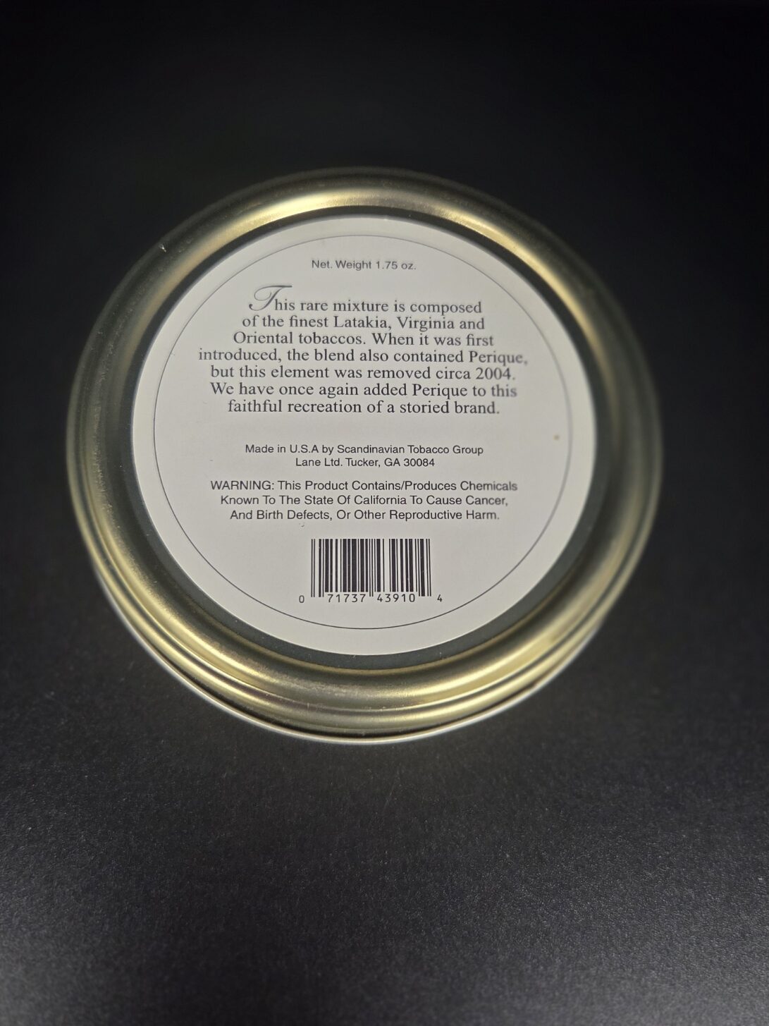 1 x 1.75oz tin. Expect a mixture composed of the finest Virginia, Mahalla, Dubac and Mountain Leaf Latakia. New and unopened. Sealed for freshness and kept in a temp controlled room.