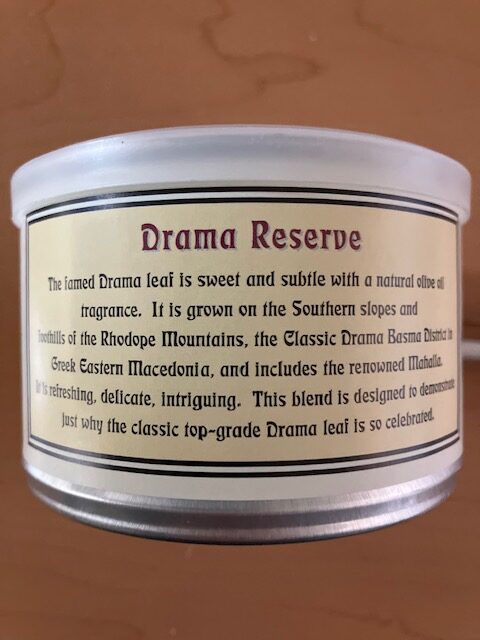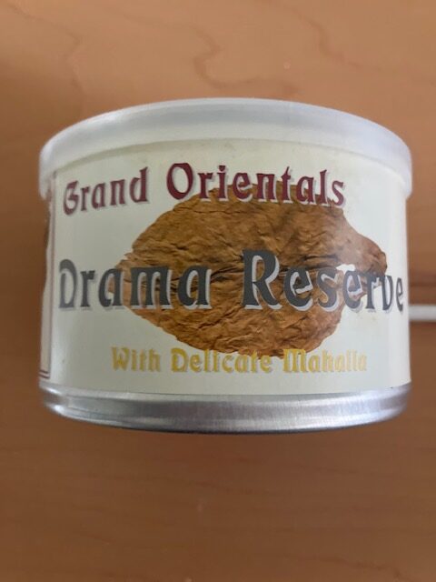17 years in my (airconditioned)cellar, this blend from the Grand Oriental Series is a ribbon cut featuring Drama leaf and is a superb Oriental/ Turkish blend with Virginia. I believe each tin is topped with a single leaf of the featured blend; here the oriental Drama leaf.