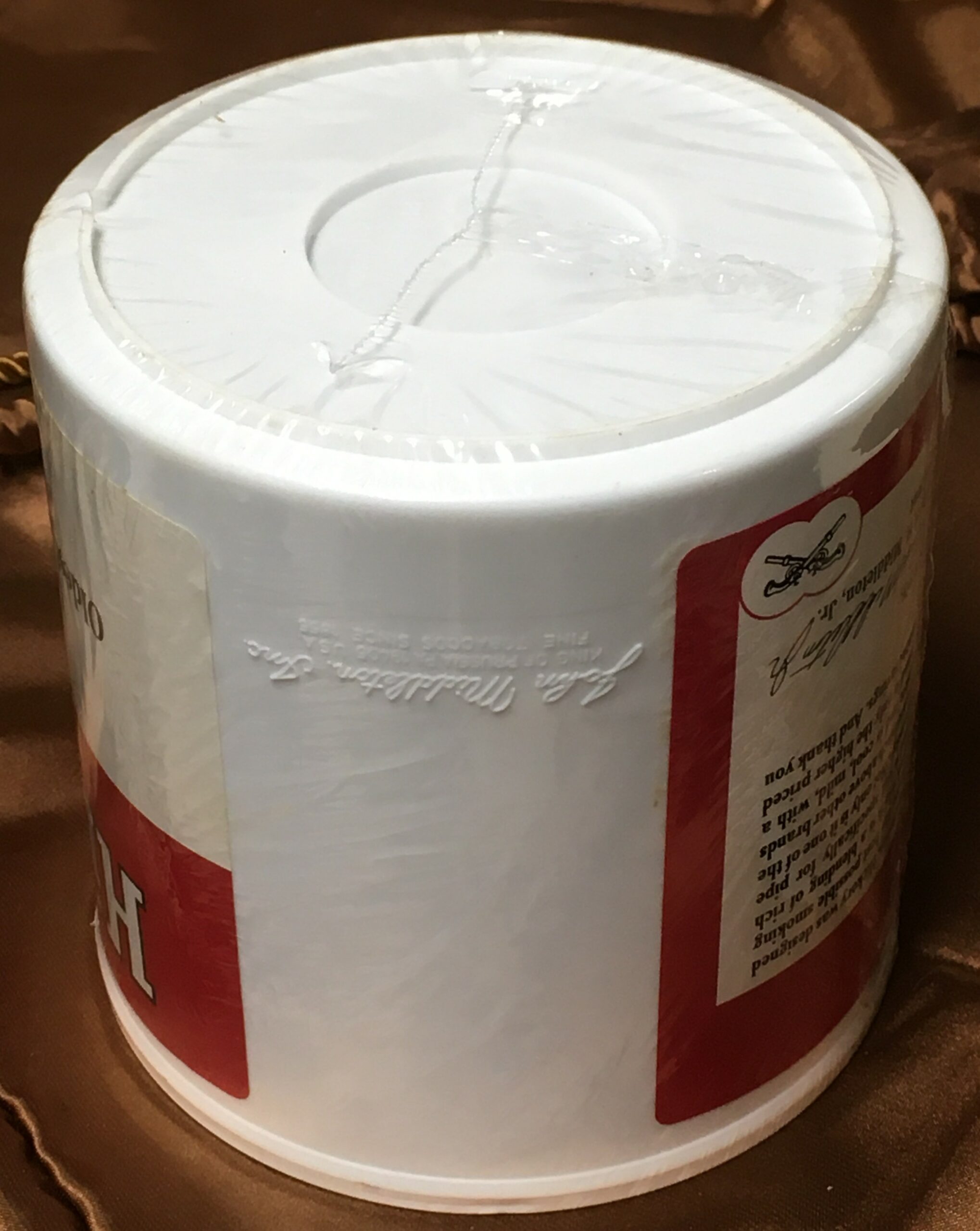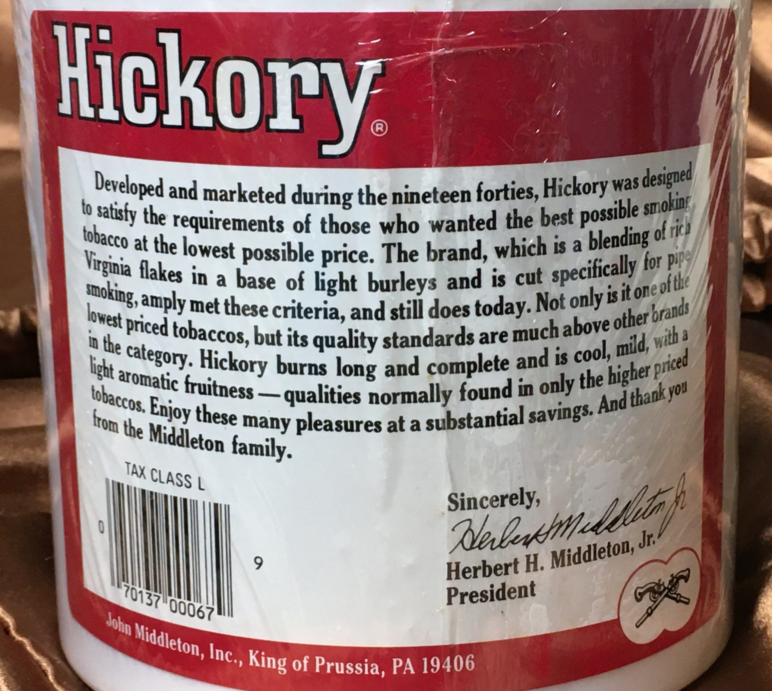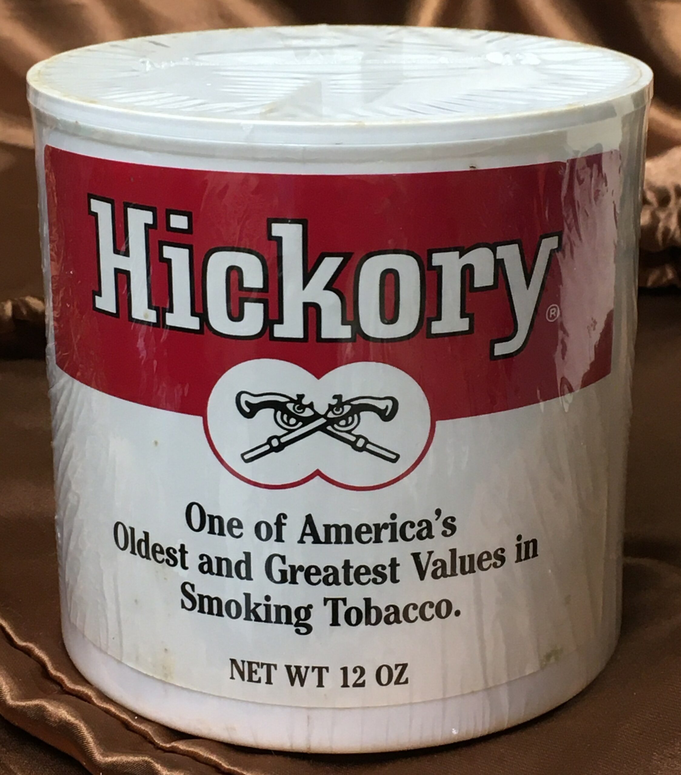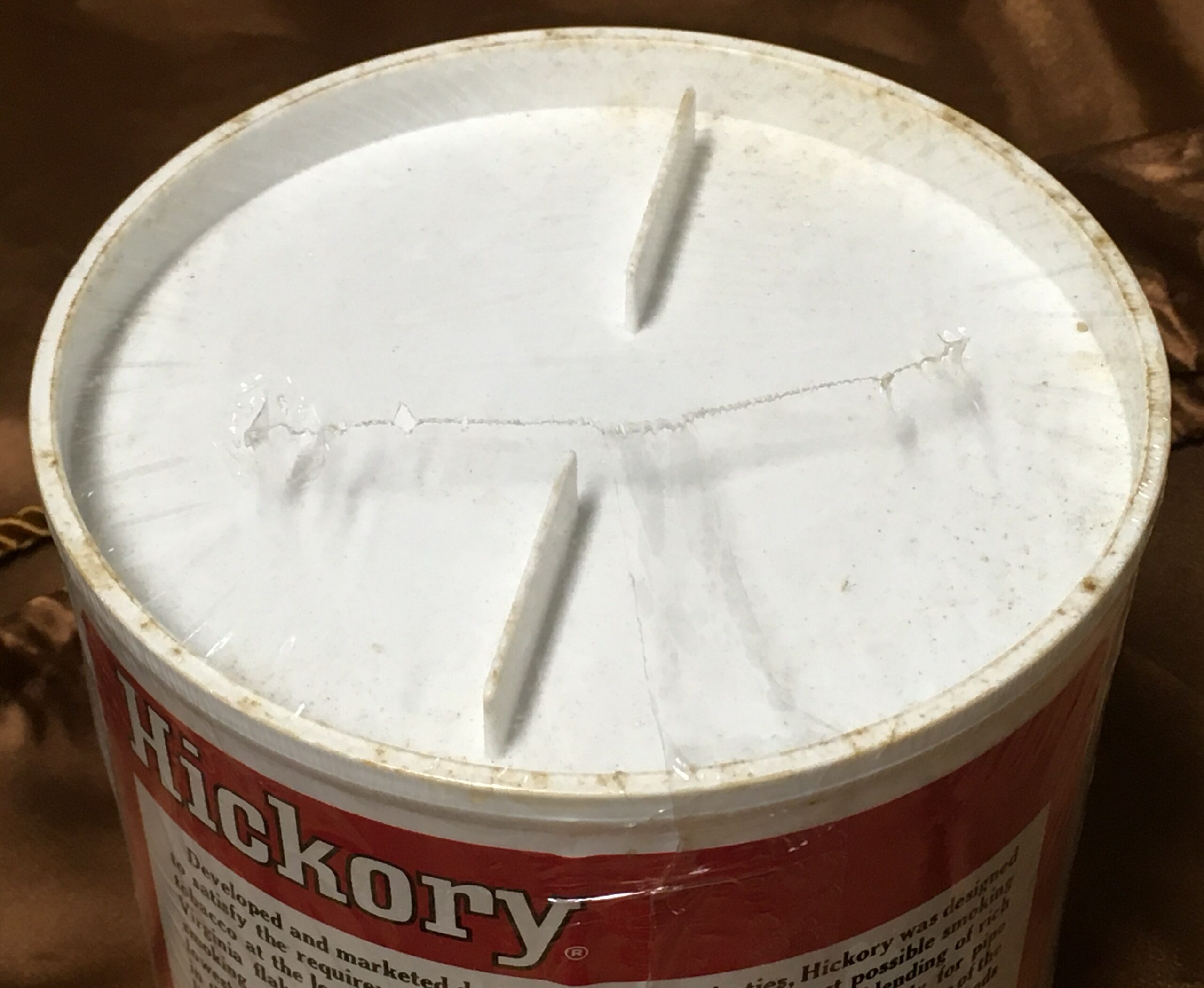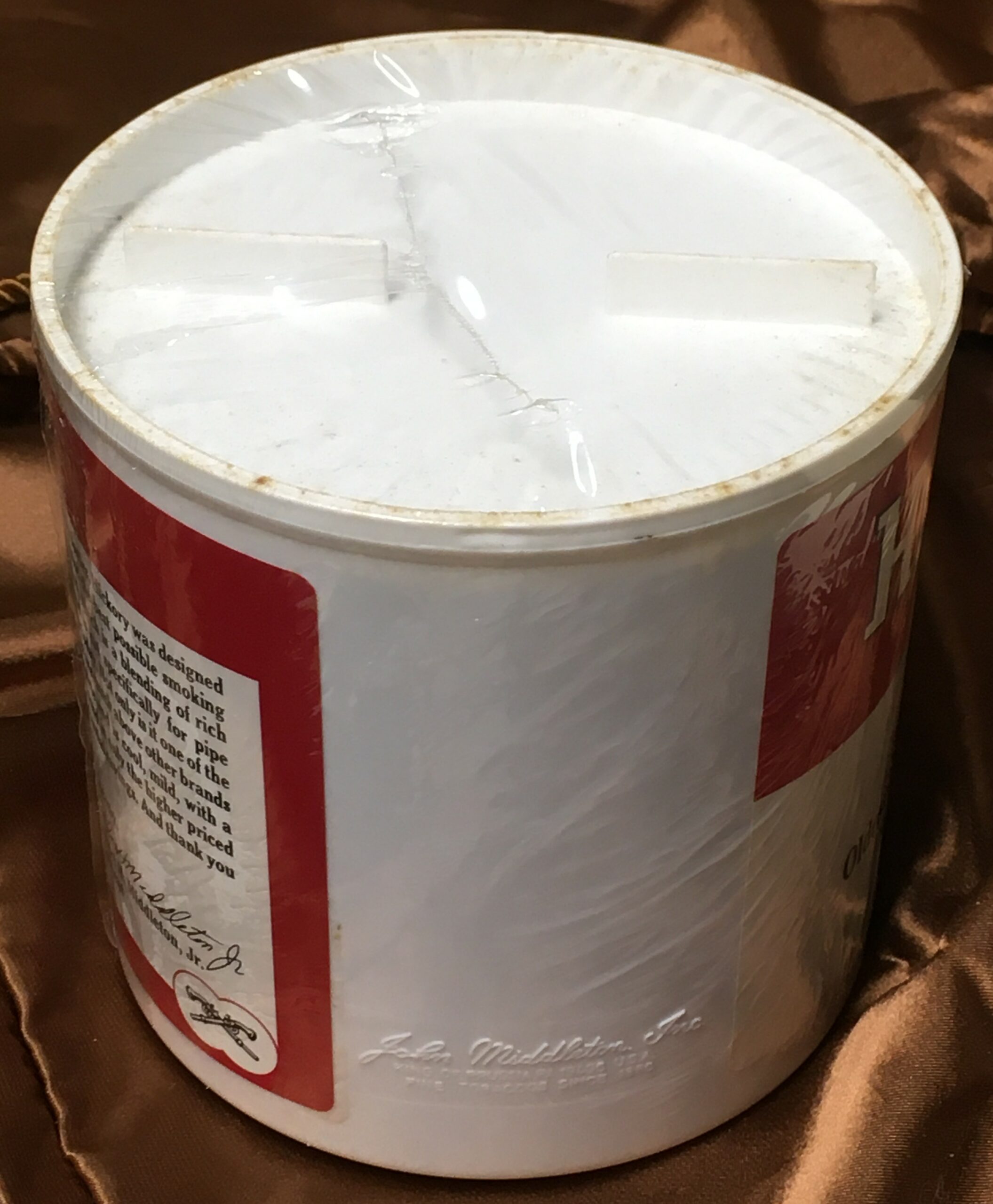 Vintage John Middleton's HICKORY Pipe Tobacco (1990s?) in 12oz sealed can. Dirt got under the clear layer of plastic wrap, and cannot not be wiped away until Buyer removes the aged cellophane. Older plastic cans of this type usually remain sealed VERY well from the factory.