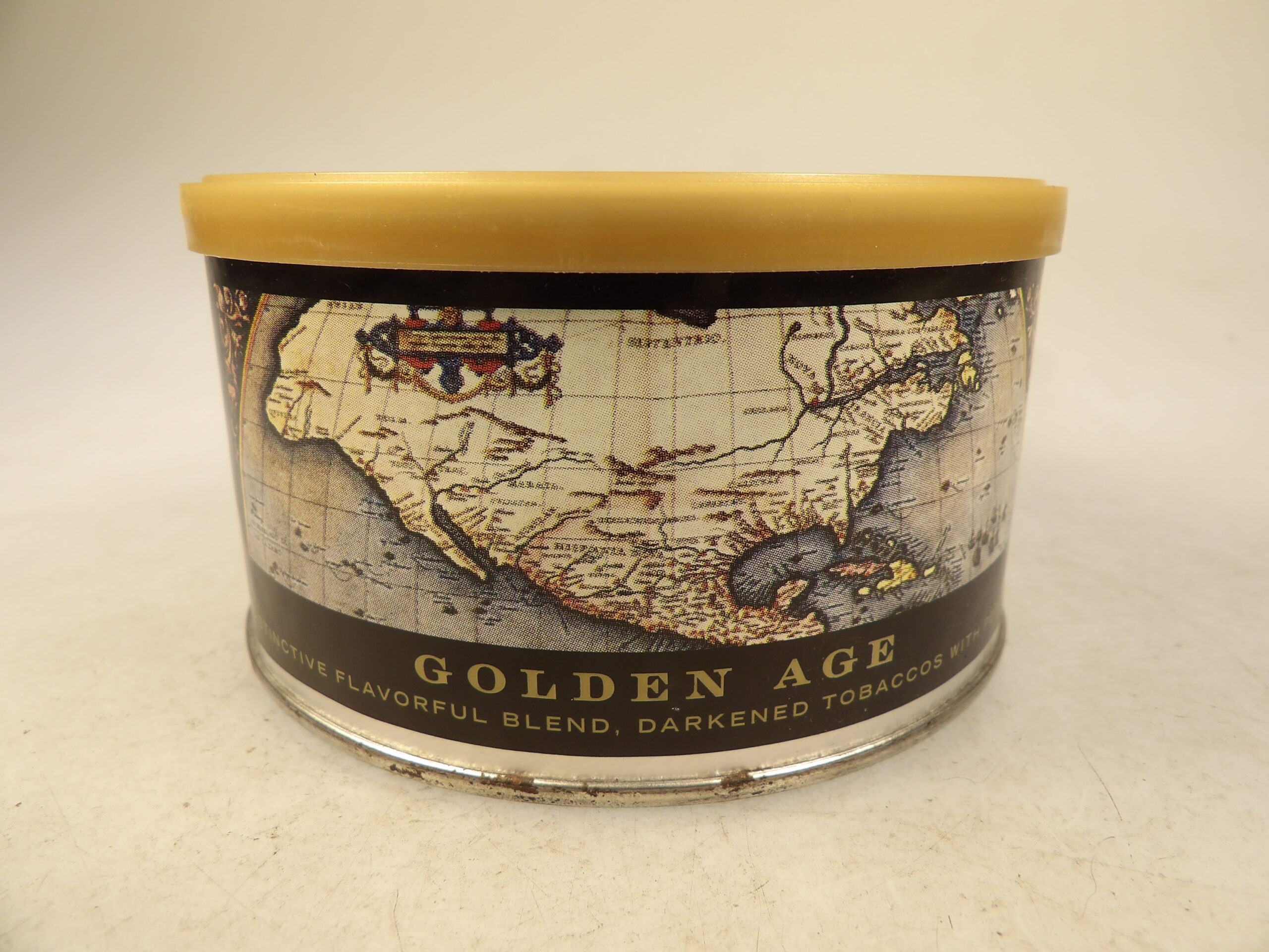 DESCRIPTION: Here is an auction sale. It is a Collectible Sutliff Golden Age Smoking Mixture not Sealed Tin 1.5 oz’s Pipe Tobacco from 2015 (estimate). Golden Age combines a variety of hand-selected Virginias, chosen for their sweetness, along with a nice share of Acadian Perique to create a blend with a rich fruitiness and an undercurrent of spice. A fan says, “The Virginia is grassy, citrus, sweet, and acts as the base for the other tobaccos. The perique is more plum and raisin than pepper, always noticeable without dominating. Lightly sweeter than Dunhill Elizabethan as made by Murray's and less spicy. The nic-hit is mild, won't bite or get harsh.” The can has rust on bottom and the seal has been compromised. Good Luck Bidding and Thanks for Stopping by. A