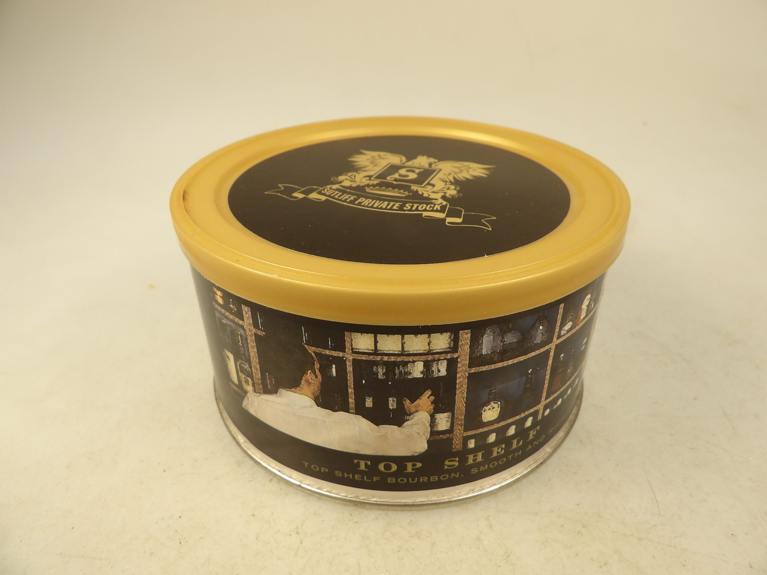 DESCRIPTION: Here is an auction sale. It is a Collectible Sealed Tin Sutliff Top Shelf Smoking Mixture 1.5 oz’s Pipe Tobacco Tin from 2015 (estimate). Dark, flavorful, and exotic. A fan says, “Another black cavendish blend that has a toned-down mellow vanilla taste, though I get a light honey note, too. This is one of the mildest BC blends I've ever smoked in terms of flavors and sweetness. It's also drier than your usual BC blend, so you need to take your time smoking it or it may burn hot. It get sweeter as you smoke it down, and near the end, I get a light fruit note. An all day smoke.” Good Luck Bidding and Thanks for Stopping by.