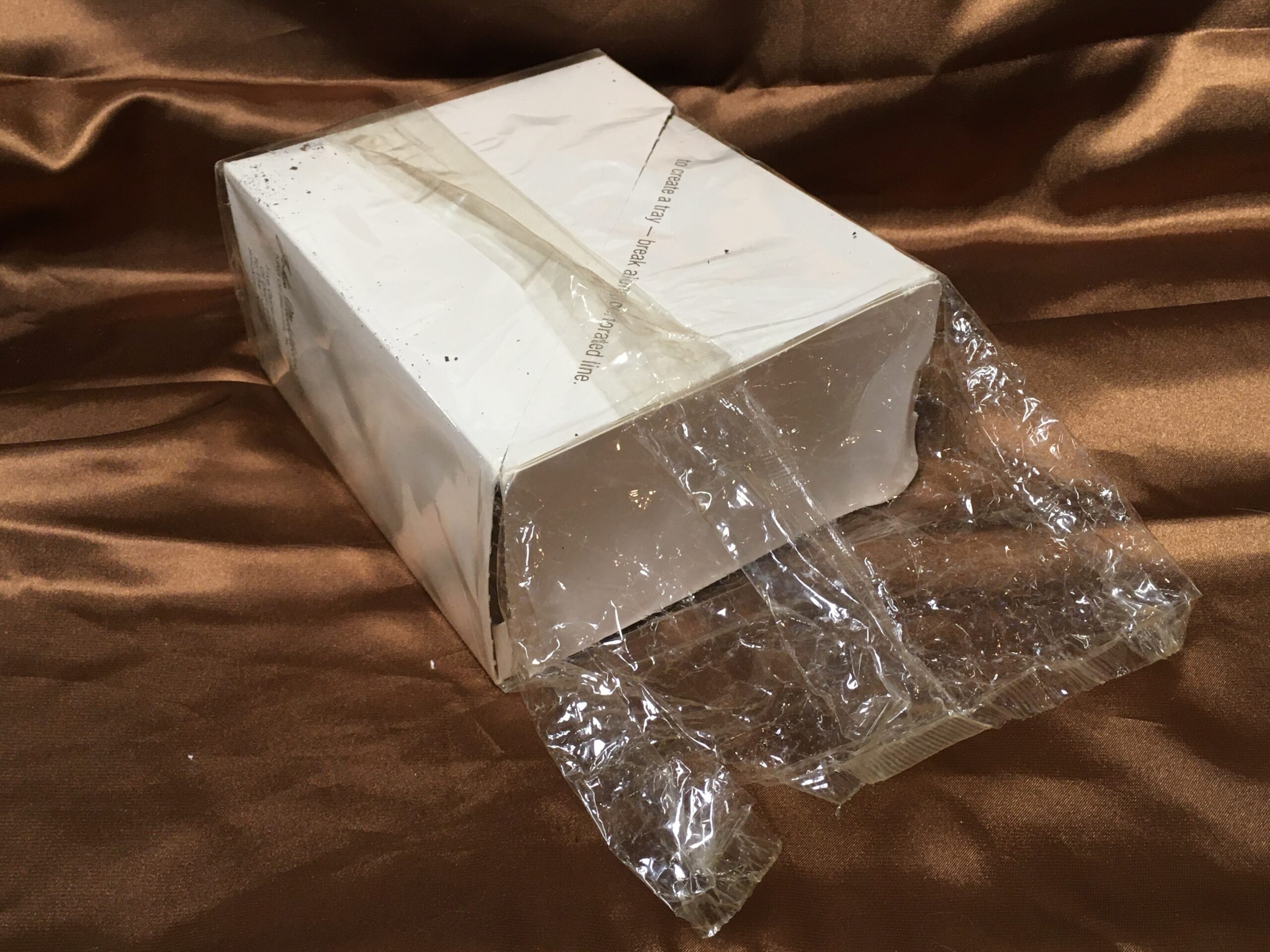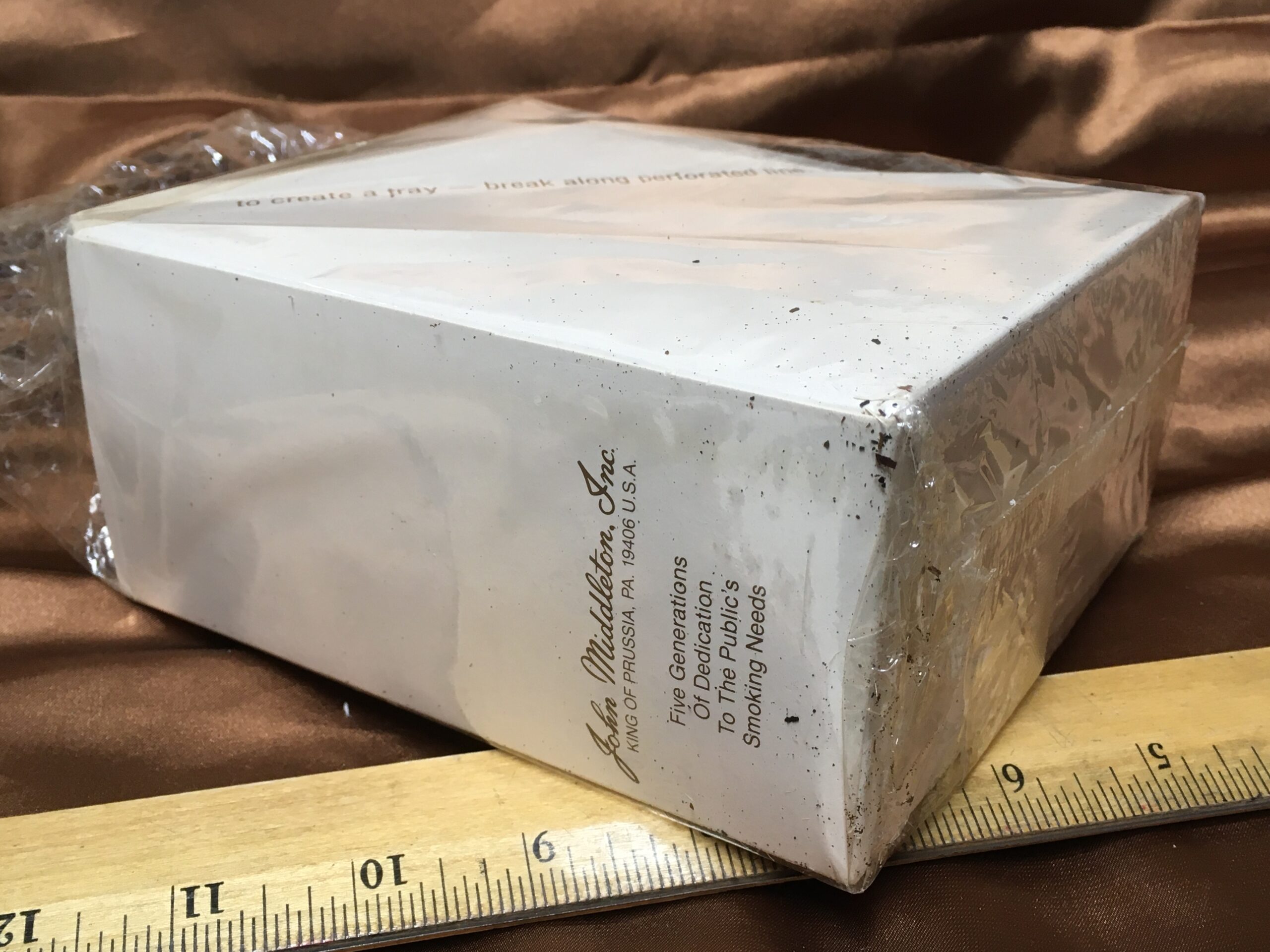 Fifty year old Cellophane sleeve-wrap has yellowed, and has a few perforations. It was factory sealed extra long, and has been stored for decades simply folded over and pressed down on top. Contents remain fully encased, proving this has never been opened. The display box is crushed slightly in front, beginning to separate the break-away top. Some corners show stock wear, and the underside of the wrap has tabak particles and is a little dirt-stained from sitting on old shelves. Moisture levels are unknown, of course.