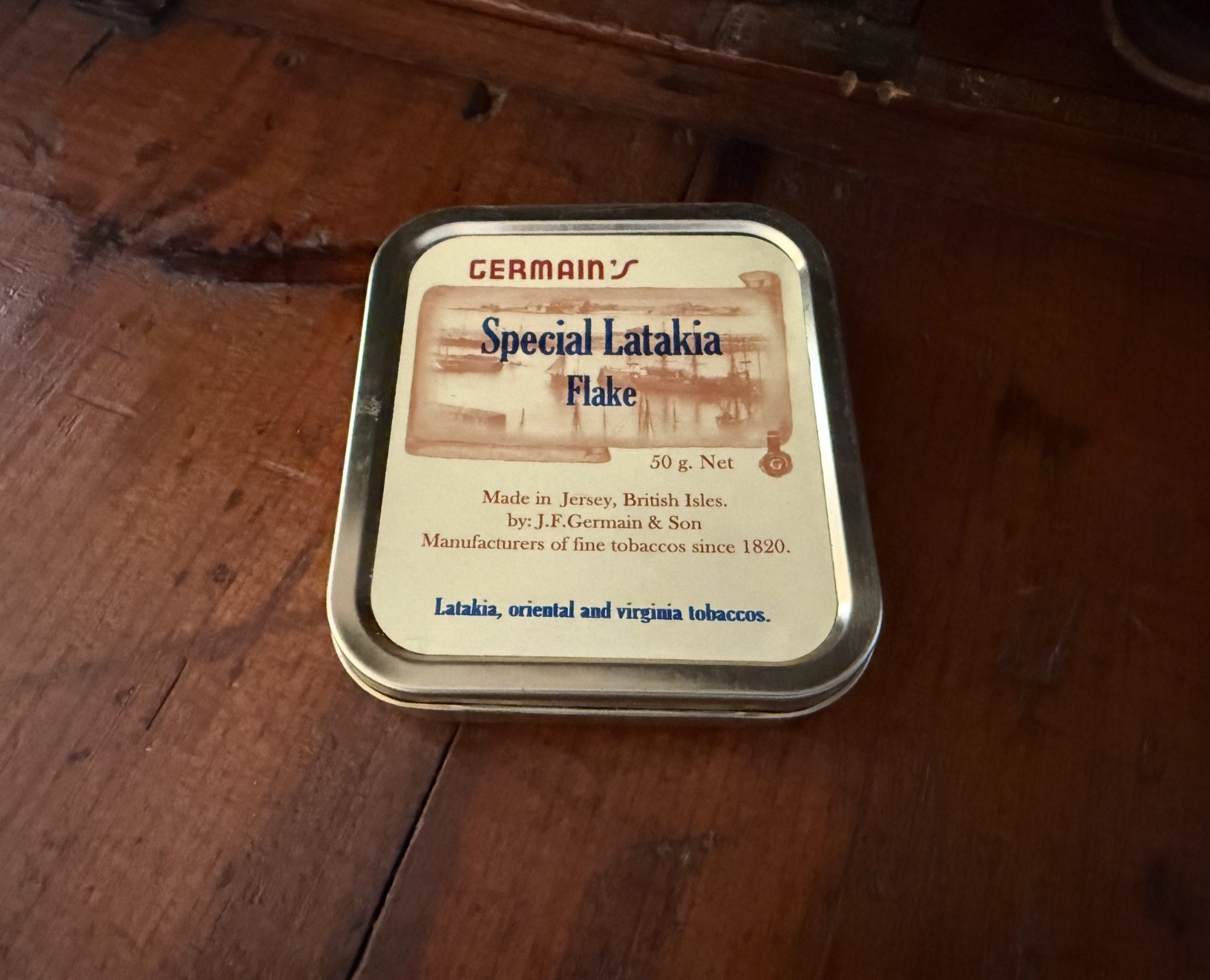 Sealed Germain’s Special Latakia Flake 50g Tin from 2017. Stored in climate controlled cabinet since purchase in 2017.