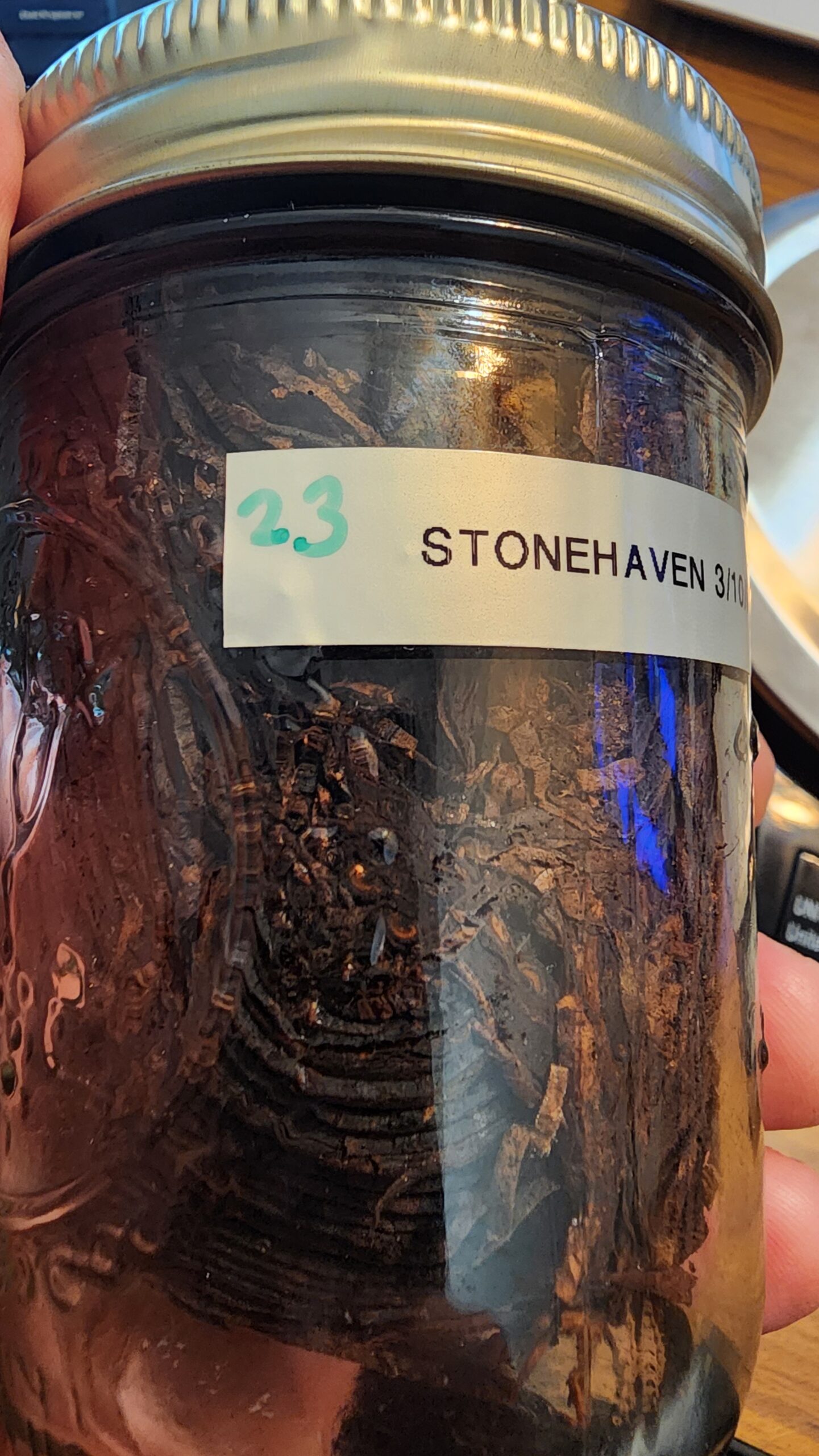 I'm nearing the end of my stash! Get this incredibly well-aged Stonehaven while you can. This is the real deal! Authentic Esoterica Stonehaven, 17 years old. I jarred this immediately upon purchase, and it has been sitting safely in a dark cabinet ever since. I opened one of these from the same vintage a few months ago, and it was sublime. You can see from the close up that the tobacco is immaculate. The jar contains 122 grams of tobacco, equivalent to 2.4 50g tins.
