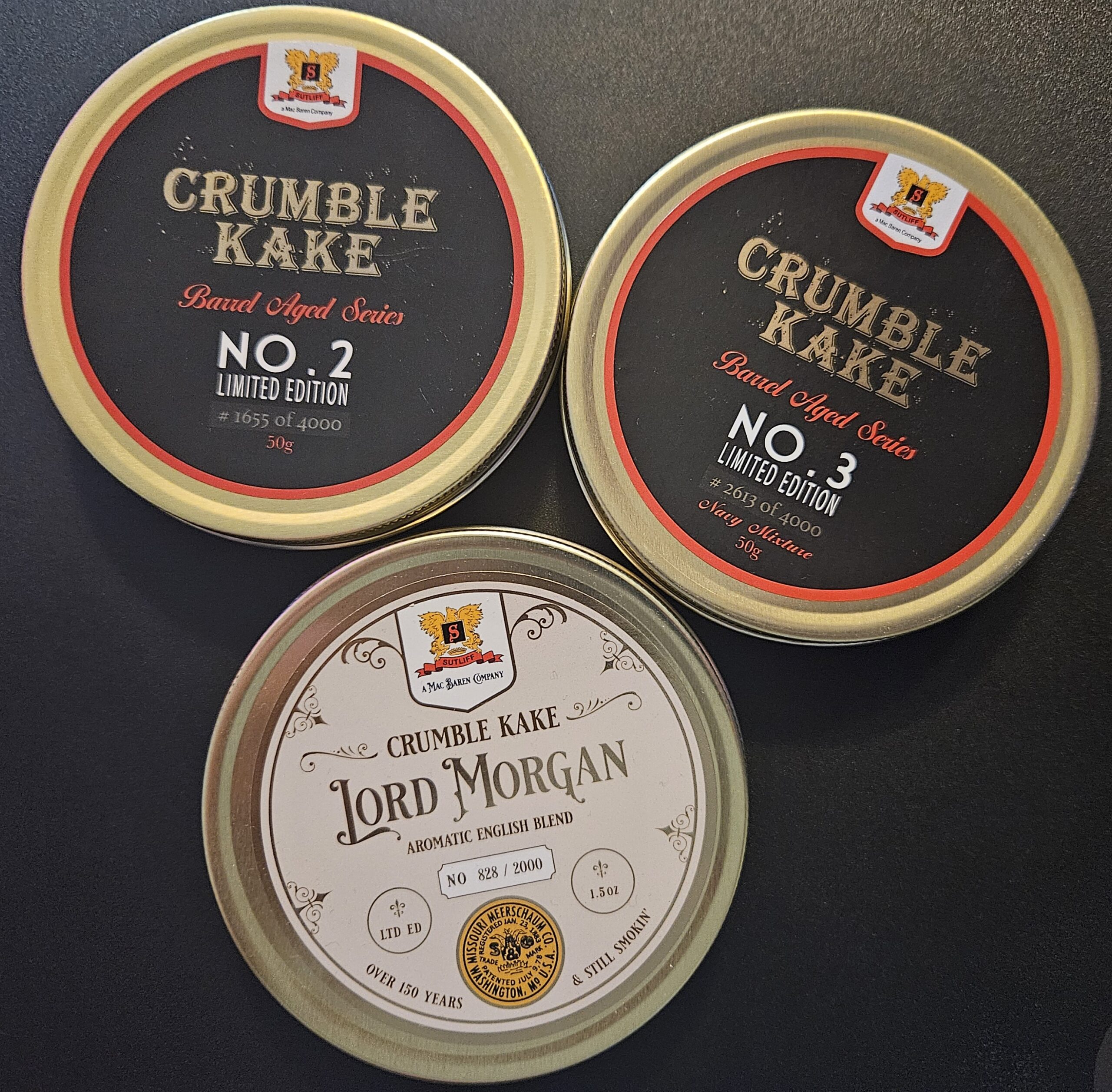 Sutliff Discontinued Tins: Crumble Kake no.2, no.3, Lord Morgan