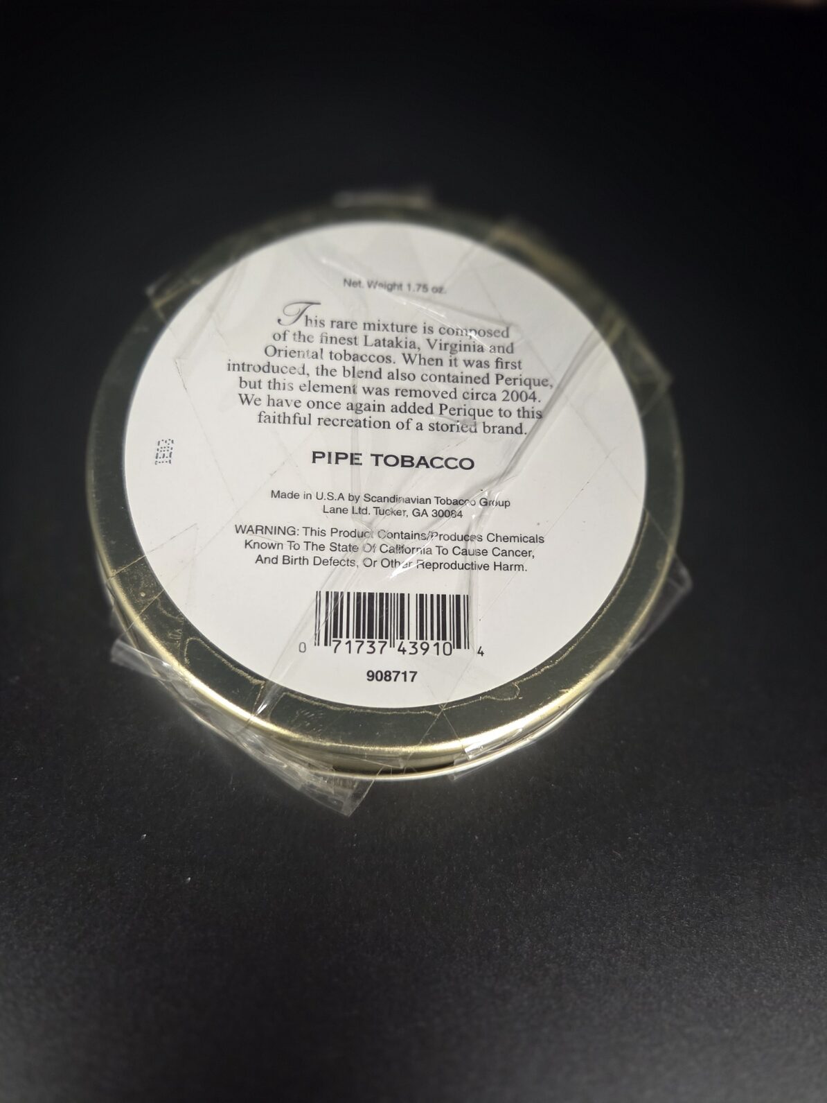 1 x 1.75oz tin. Expect a mixture composed of the finest Virginia, Mahalla, Dubac and Mountain Leaf Latakia. Not sealed, taped shut. Kept in a temp controlled room.